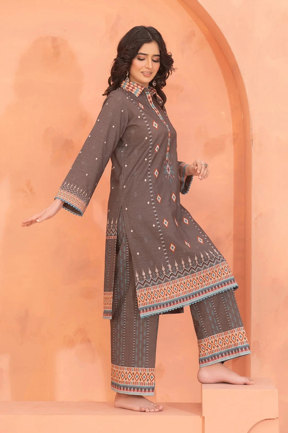 The suit features a beautifully printed khaddar fabric with intricate patterns that are both stylish and versatile for various occasions.