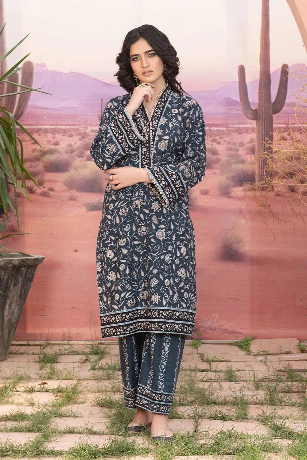The suit features a beautifully printed khaddar fabric with intricate patterns that are both stylish and versatile for various occasions.
