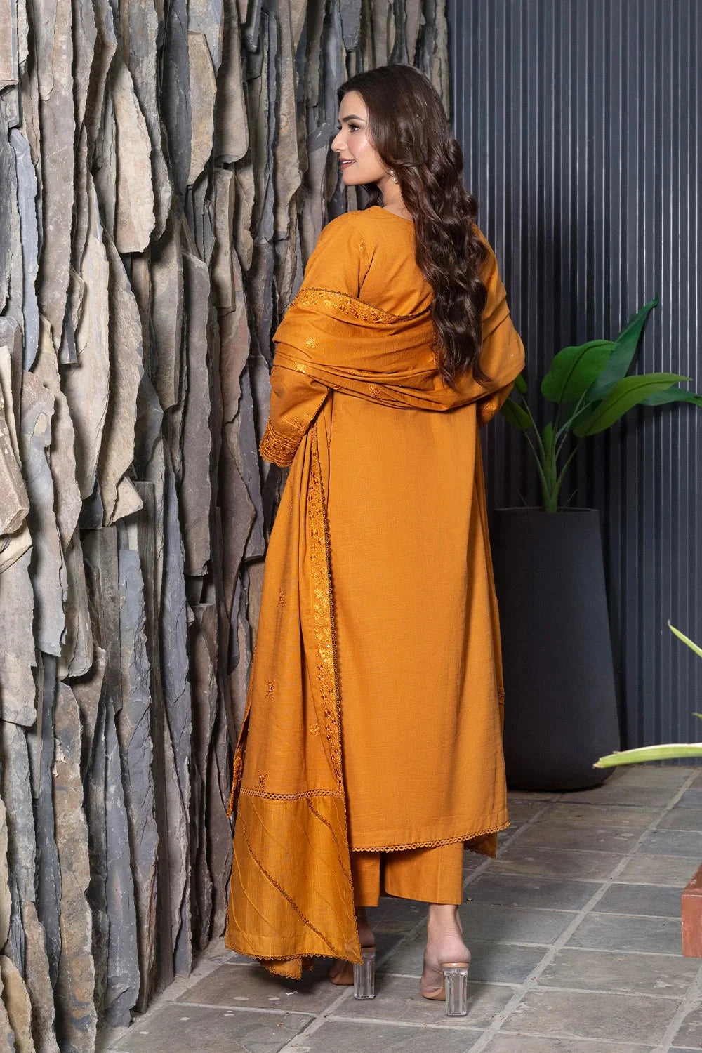 The suit features a beautifully embroidered khaddar fabric with intricate patterns that are both stylish and versatile for various occasions.