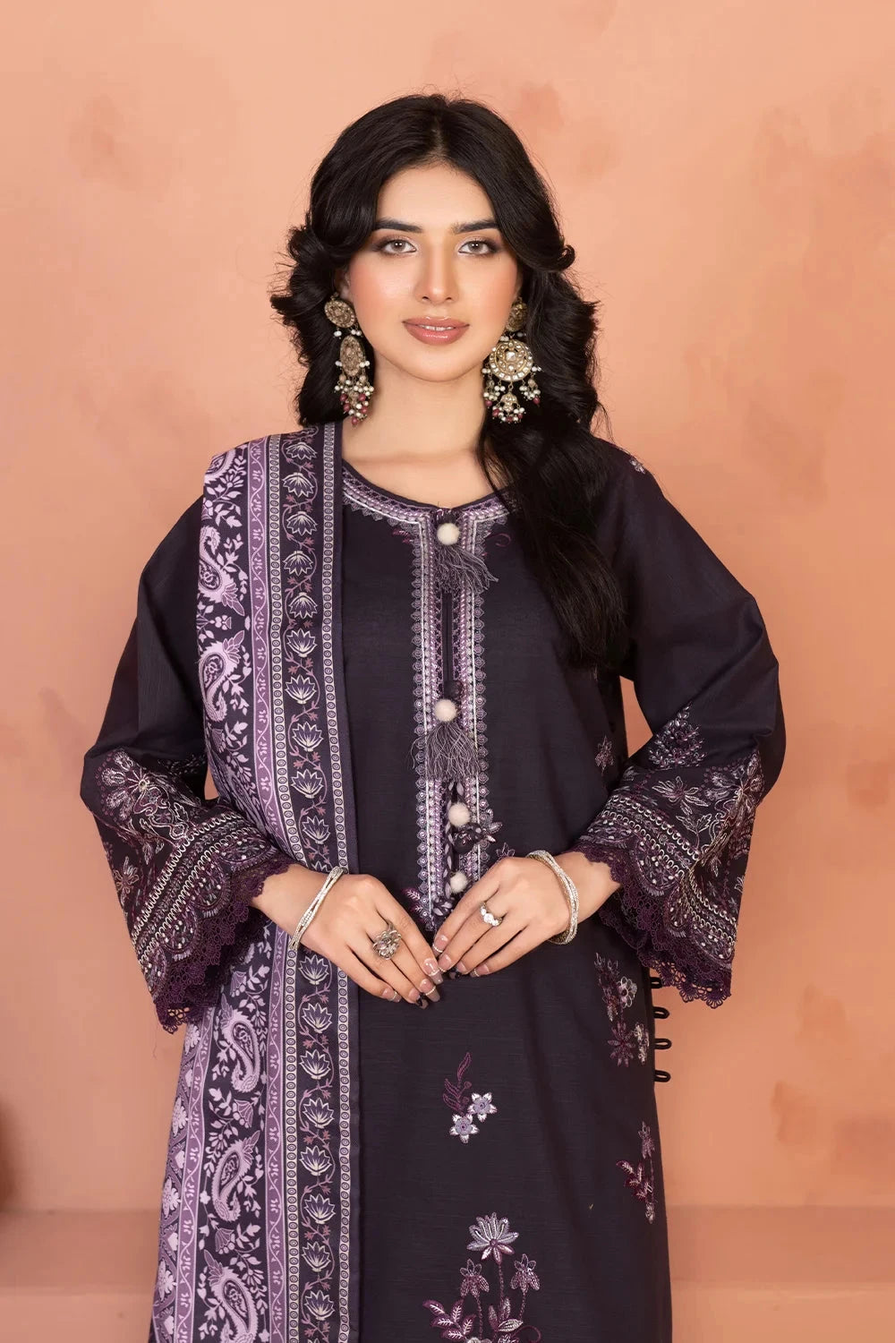 The suit features a beautifully embroidered khaddar fabric with intricate patterns that are both stylish and versatile for various occasions.