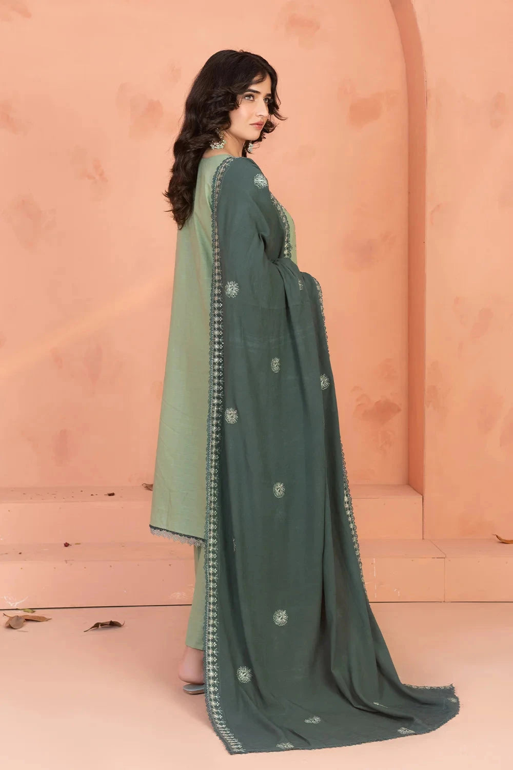 Explore Winter vibes 3pc Embroidered Khaddar Suit this collection features embroidered Khaddar shirt and trouser with Printed Khaddar Dupatta.
