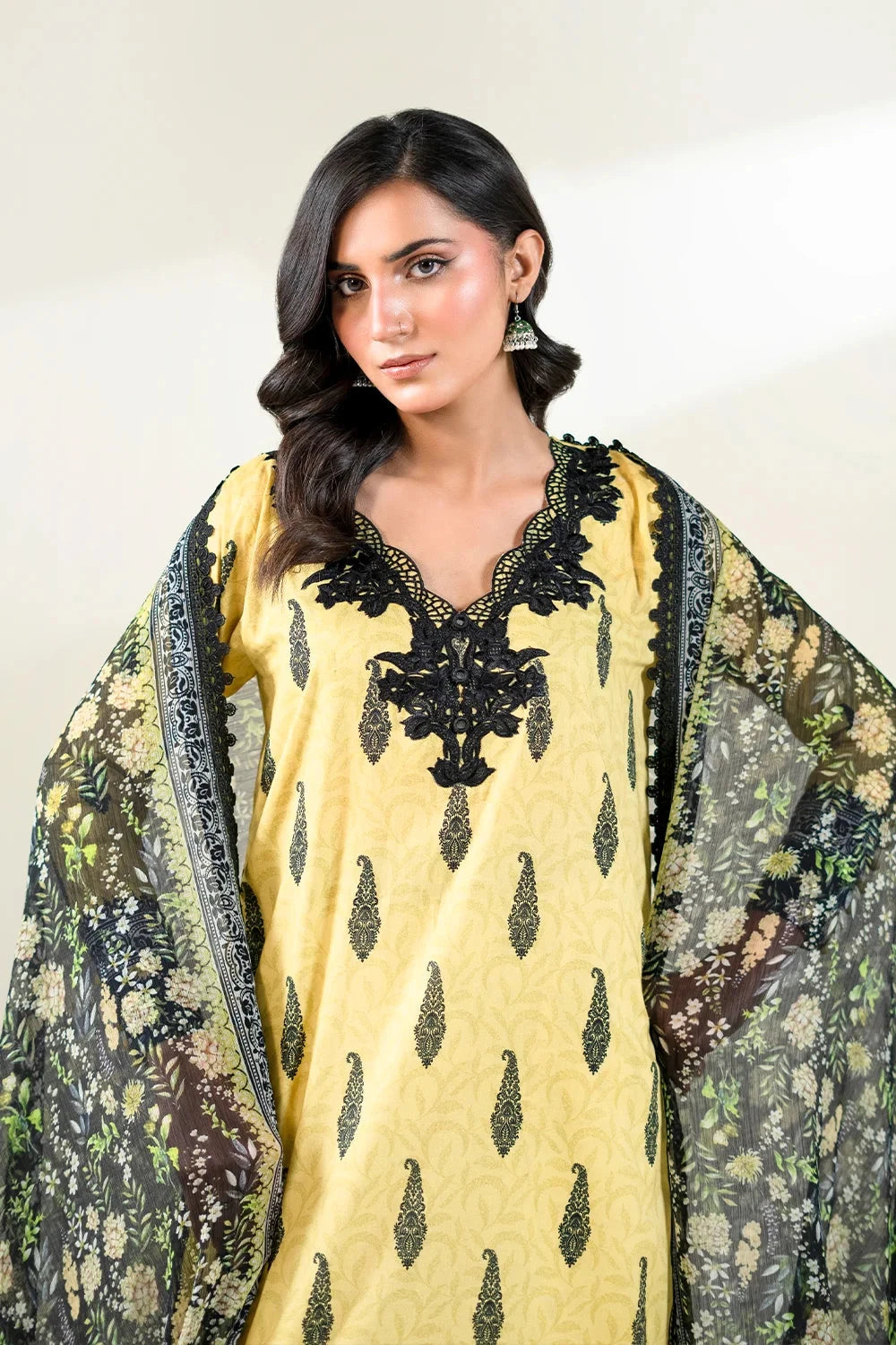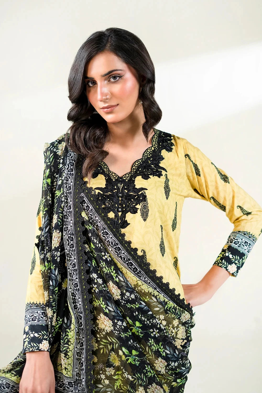 A stylish and breathable 3-piece lawn suit featuring a embroidered printed shirt, printed trouser, and matching printed chiffon dupatta-perfect for effortless elegance and all-day comfort.