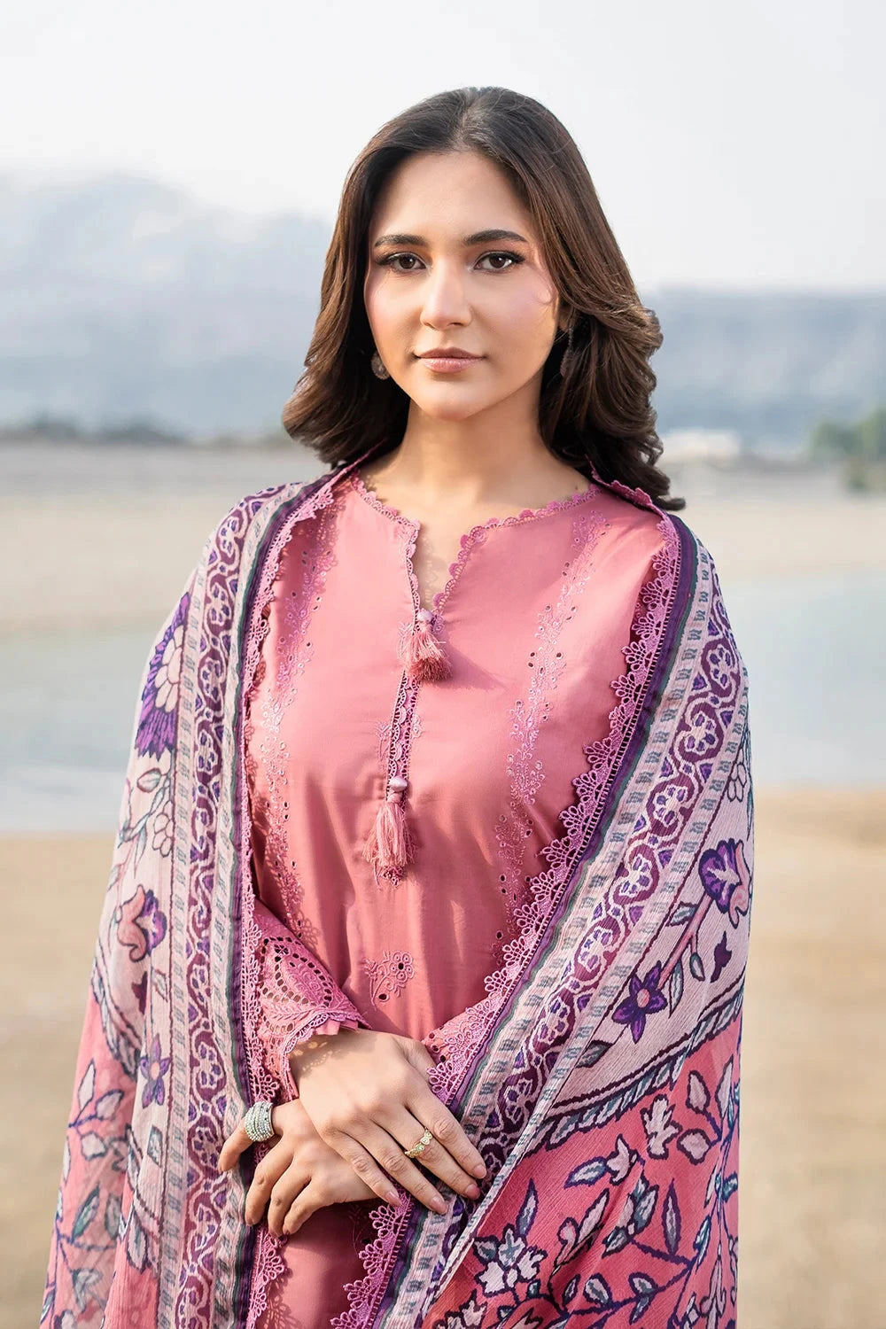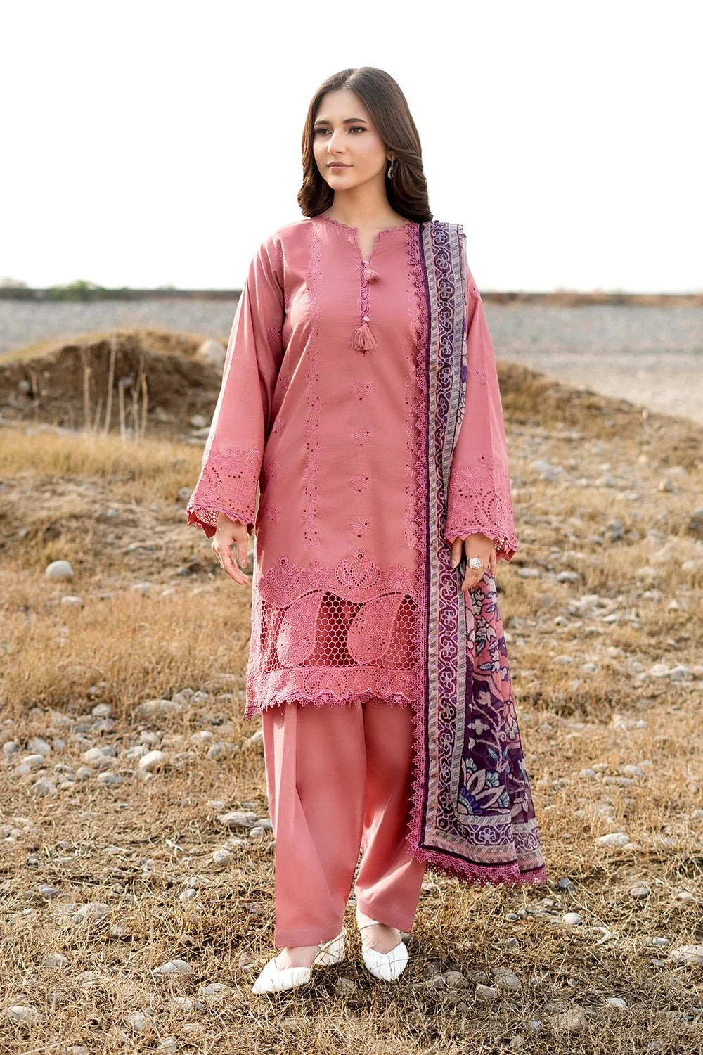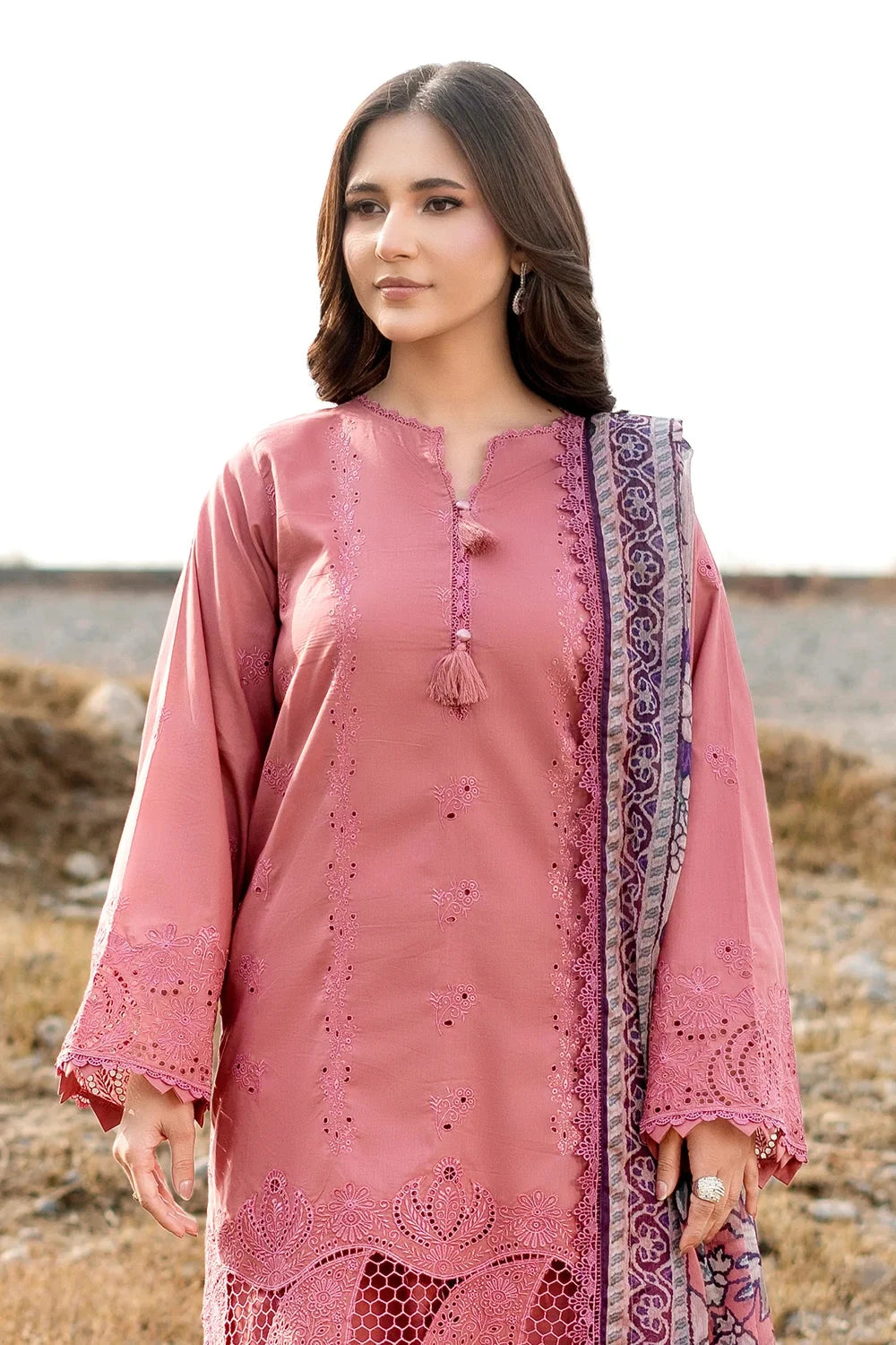 A stylish and breathable 3-piece lawn suit featuring a embroidered shirt, dyed trouser, and matching printed chiffon dupatta-perfect for effortless elegance and all-day comfort.