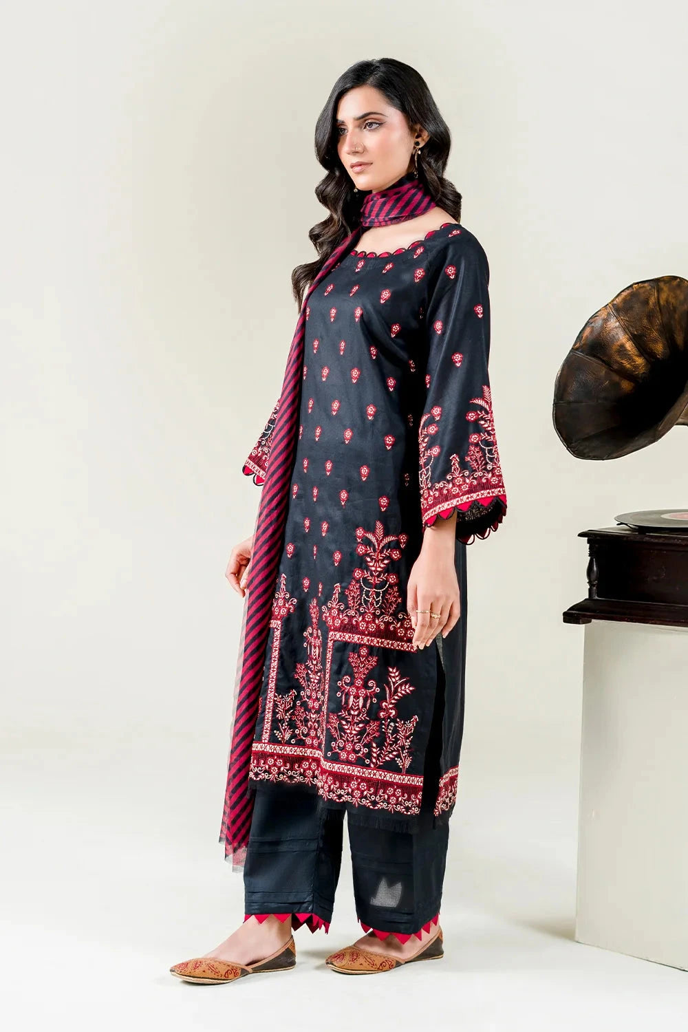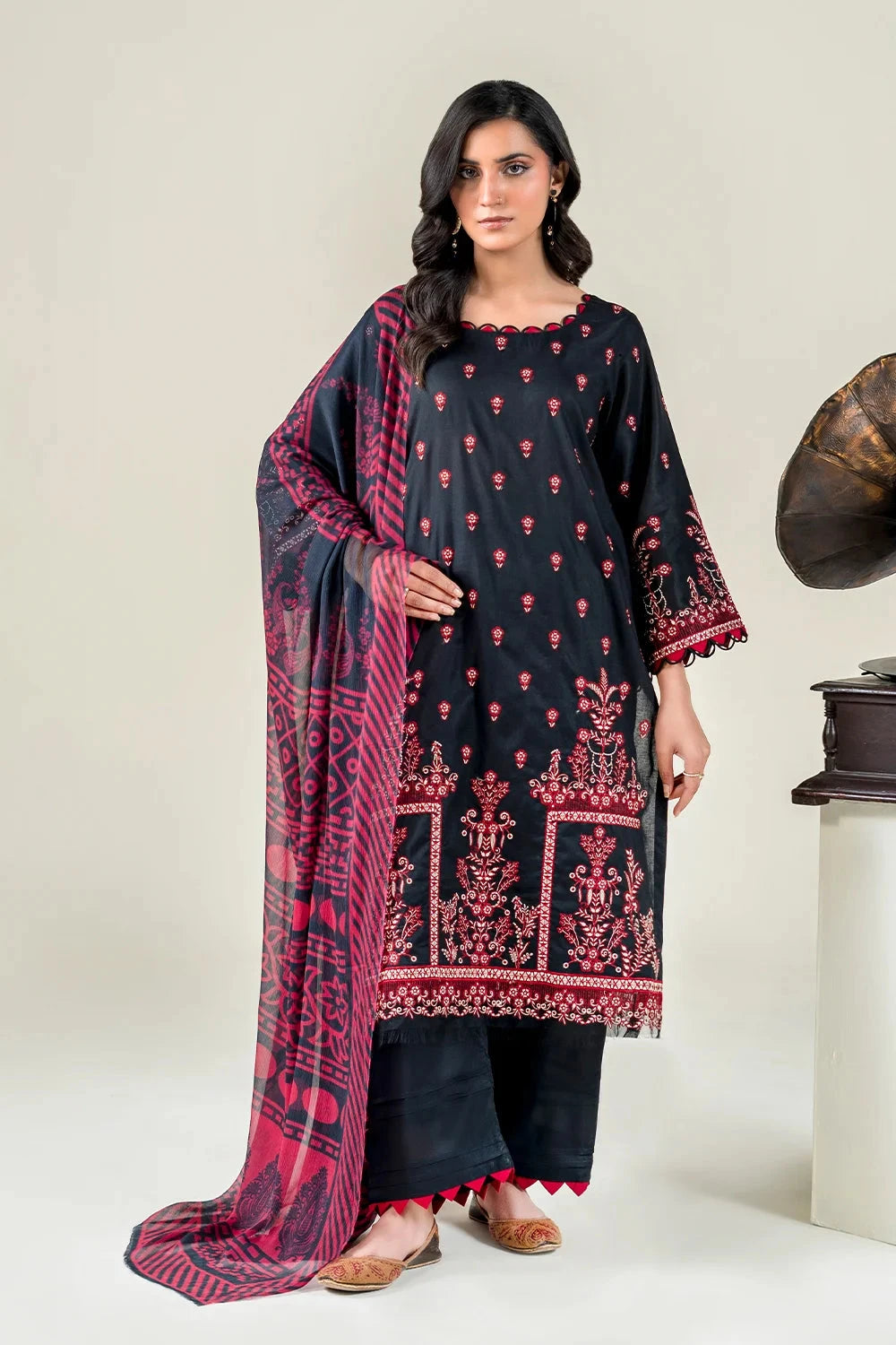 A stylish and breathable 3-piece lawn suit featuring a embroidered shirt, dyed trouser, and matching printed chiffon dupatta-perfect for effortless elegance and all-day comfort.