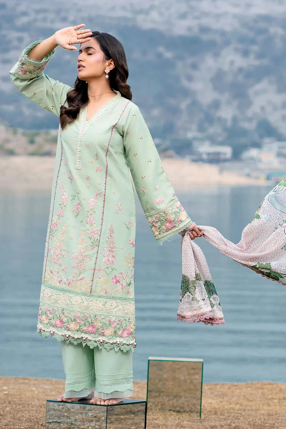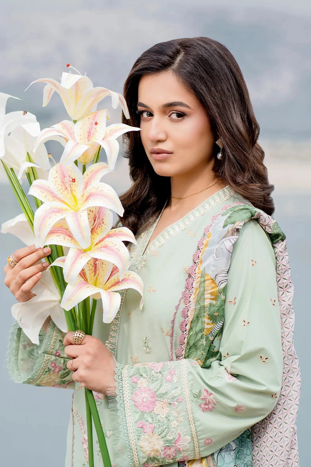 A stylish and breathable 3-piece lawn suit featuring a embroidered shirt, dyed trouser, and matching printed silk dupatta-perfect for effortless elegance and all-day comfort.