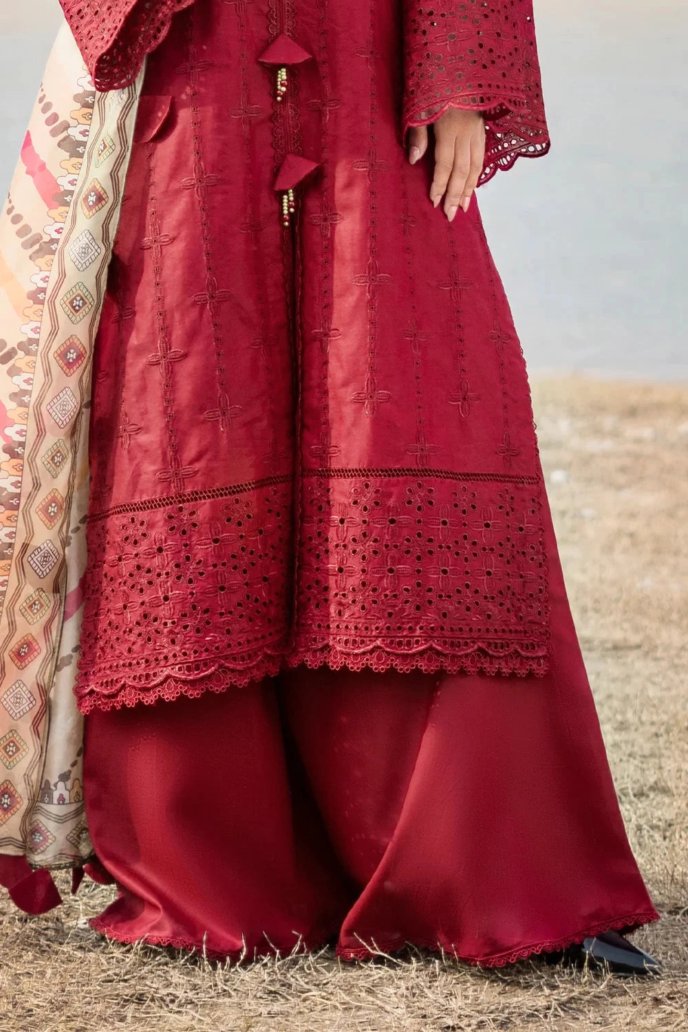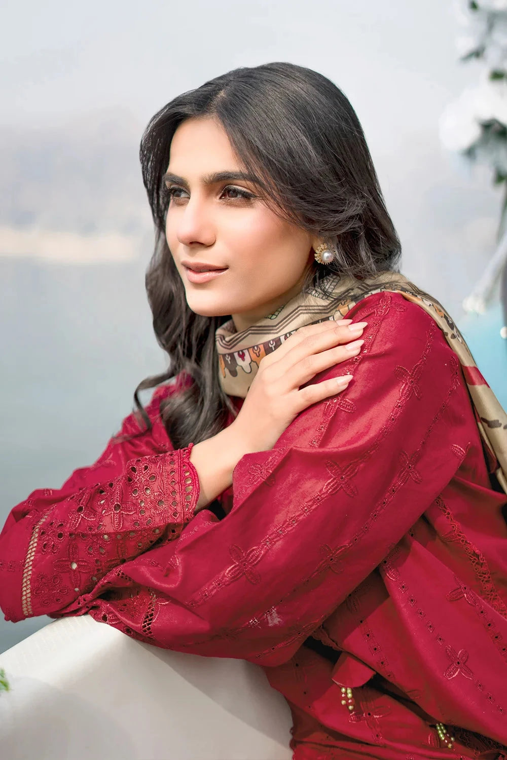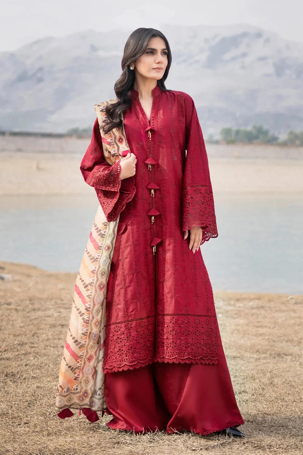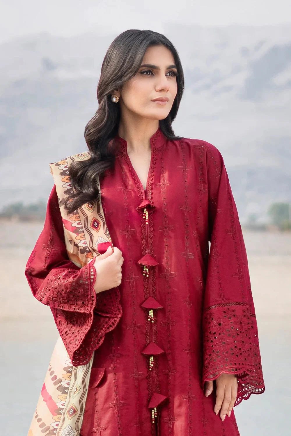 A stylish and breathable 3-piece lawn suit featuring a embroidered shirt, dyed trouser, and matching printed silk dupatta-perfect for effortless elegance and all-day comfort.