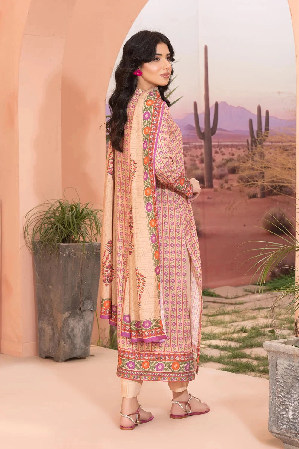 The suit features a beautifully printed karandi fabric with intricate patterns that are both stylish and versatile for various occasions.