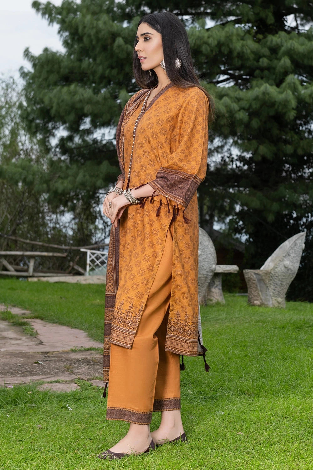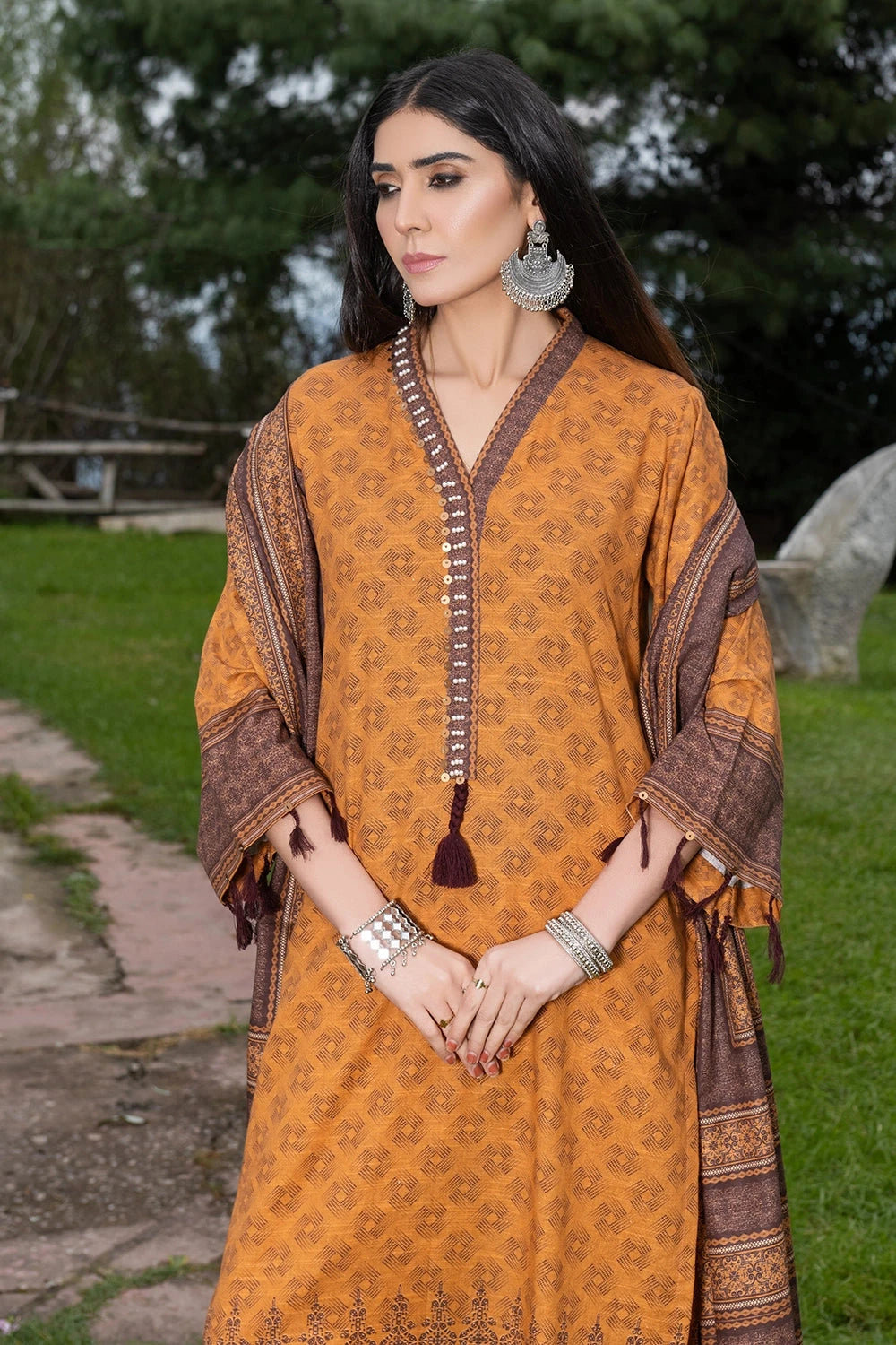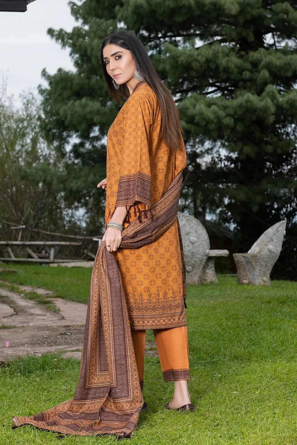 The suit features a beautifully printed khaddar fabric with intricate patterns that are both stylish and versatile for various occasions.
