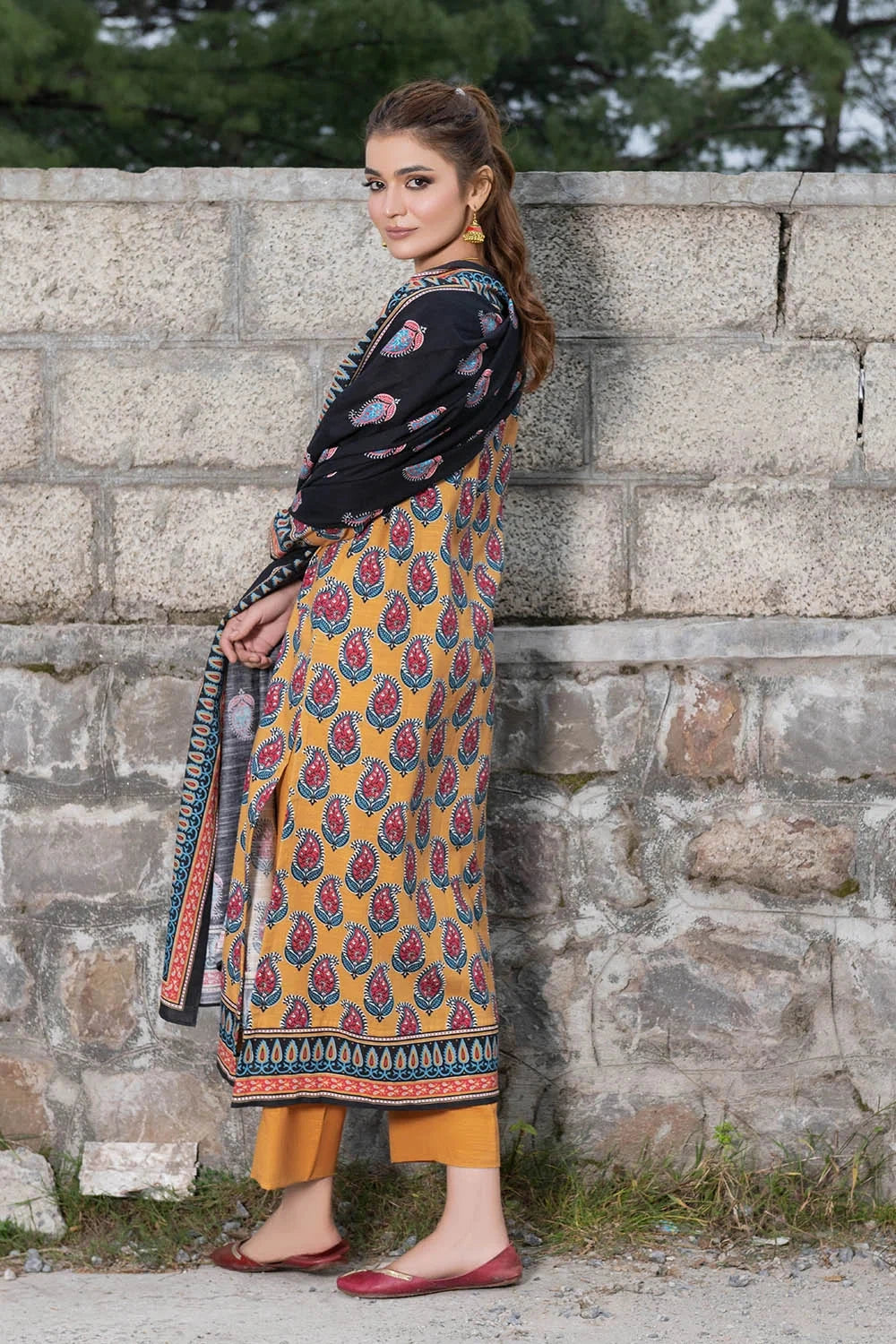 The suit features a beautifully printed khaddar fabric with intricate patterns that are both stylish and versatile for various occasions.
