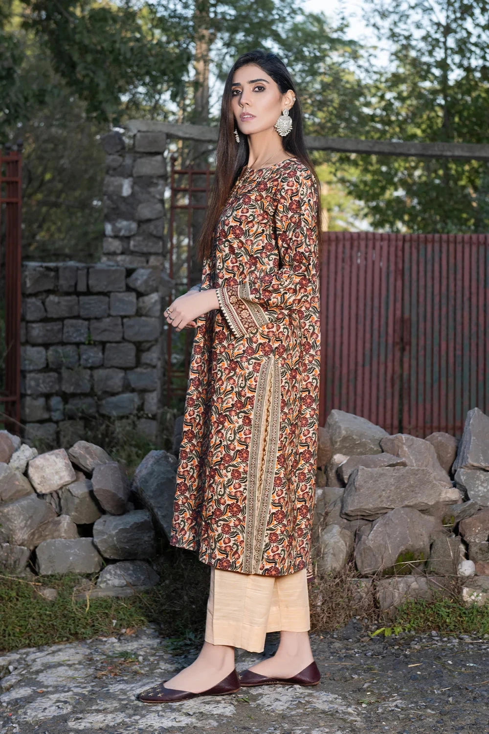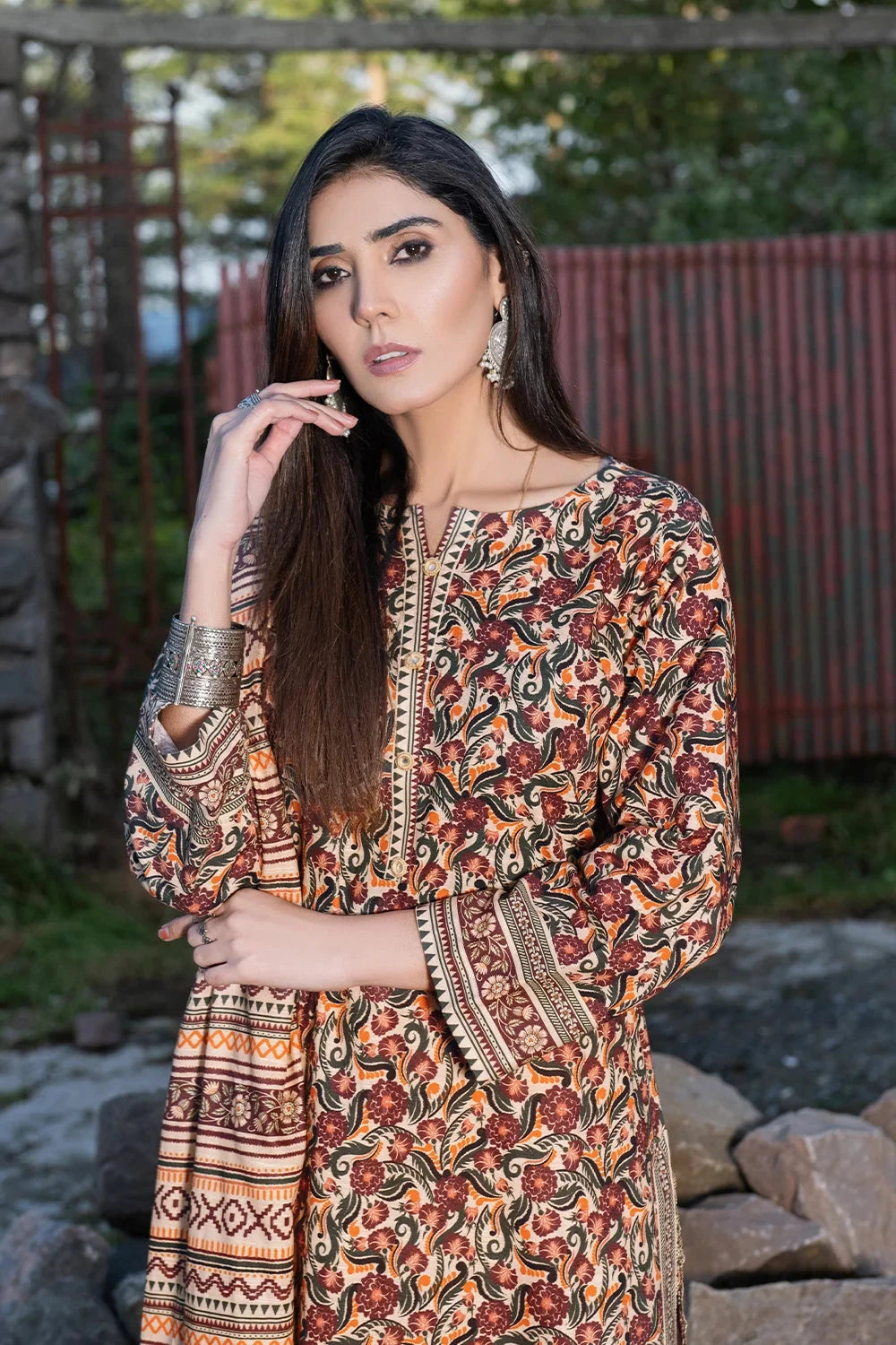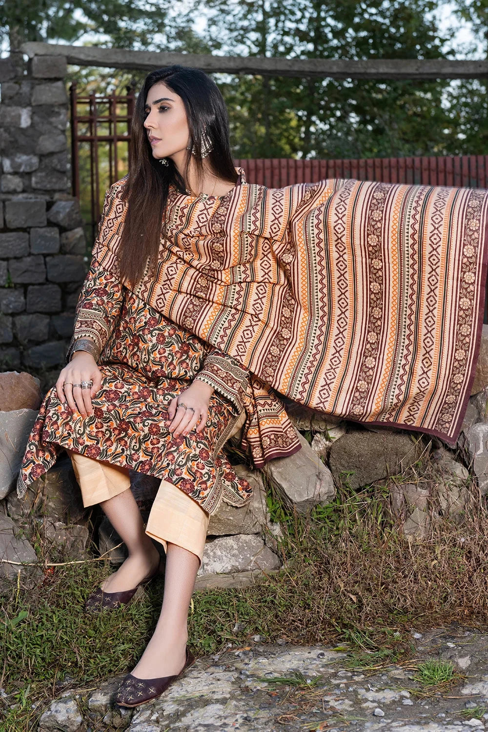 The suit features a beautifully printed khaddar fabric with intricate patterns that are both stylish and versatile for various occasions.