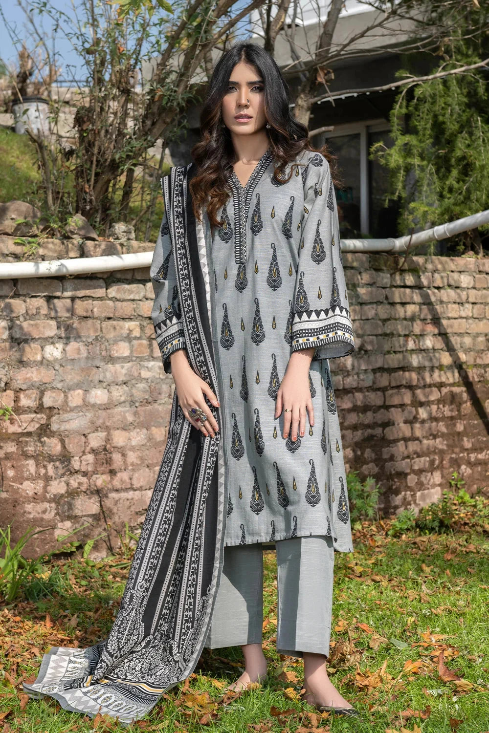 The suit features a beautifully printed khaddar fabric with intricate patterns that are both stylish and versatile for various occasions.