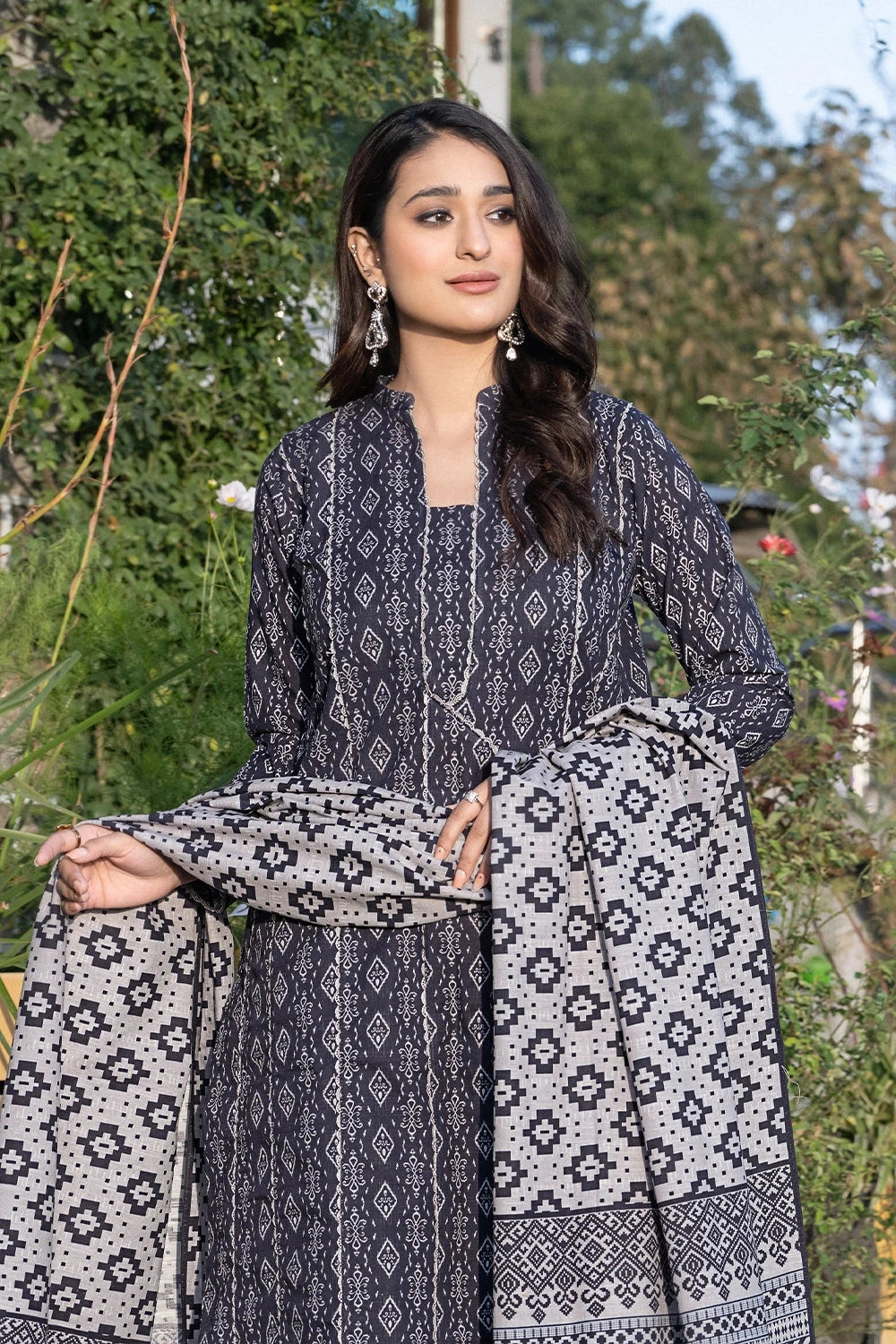 The suit features a beautifully printed khaddar fabric with intricate patterns that are both stylish and versatile for various occasions.