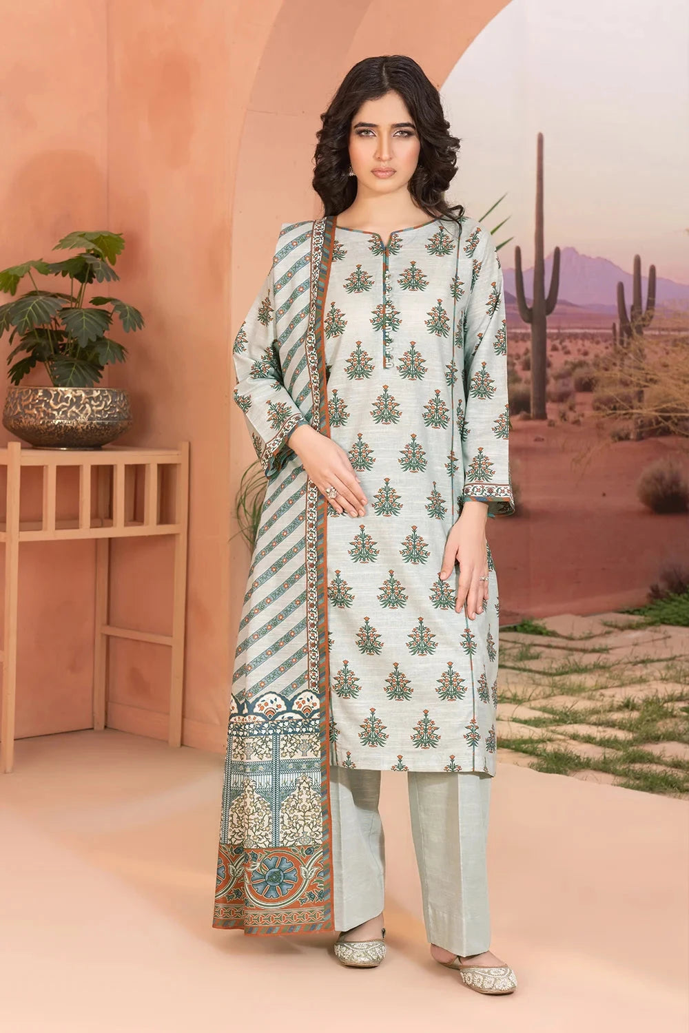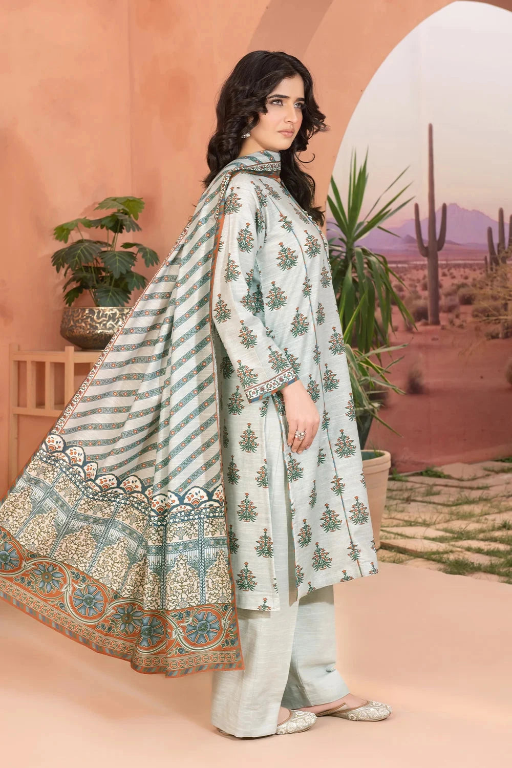 The suit features a beautifully printed khaddar fabric with intricate patterns that are both stylish and versatile for various occasions.
