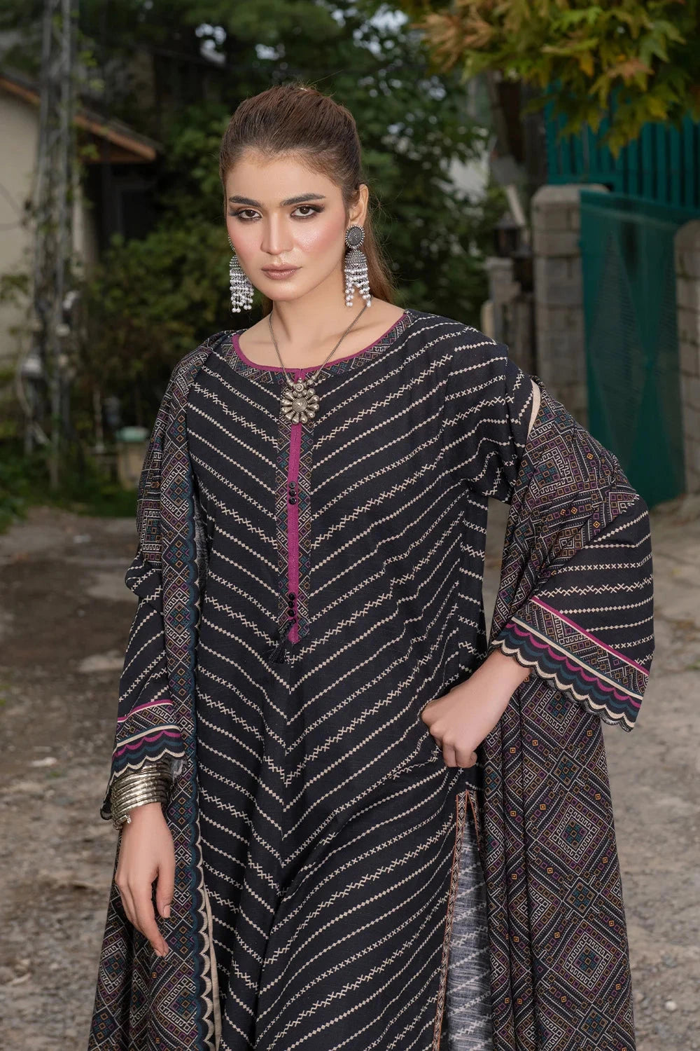 The suit features a beautifully printed khaddar fabric with intricate patterns that are both stylish and versatile for various occasions.