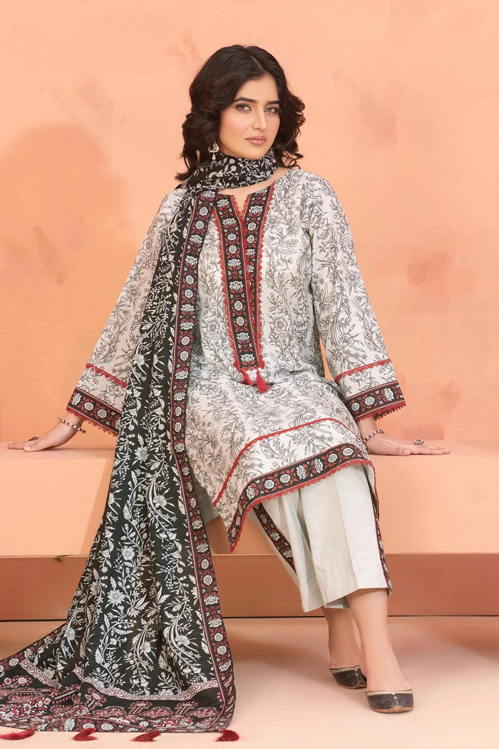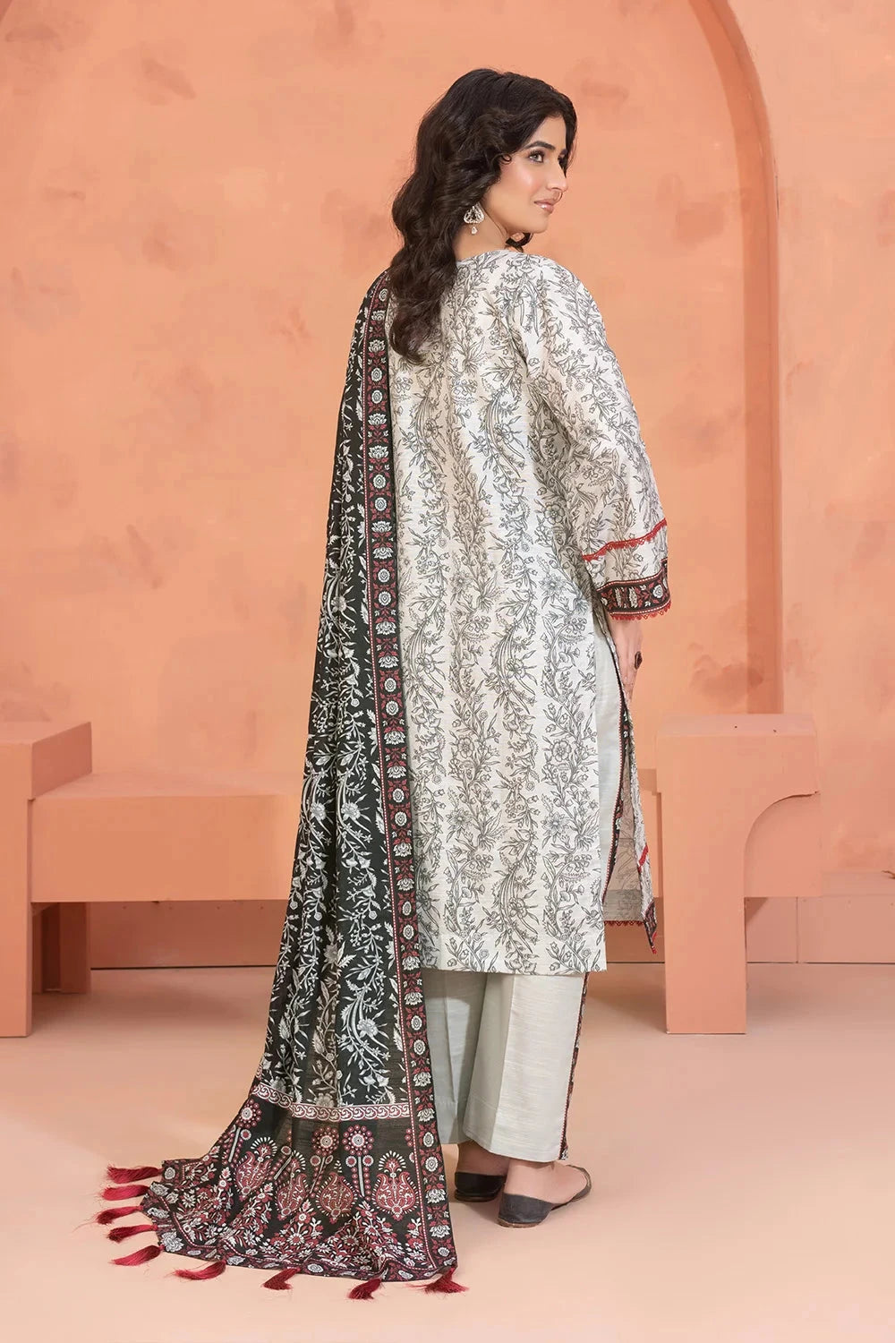The suit features a beautifully printed khaddar fabric with intricate patterns that are both stylish and versatile for various occasions.