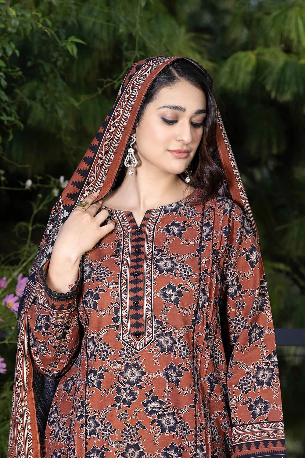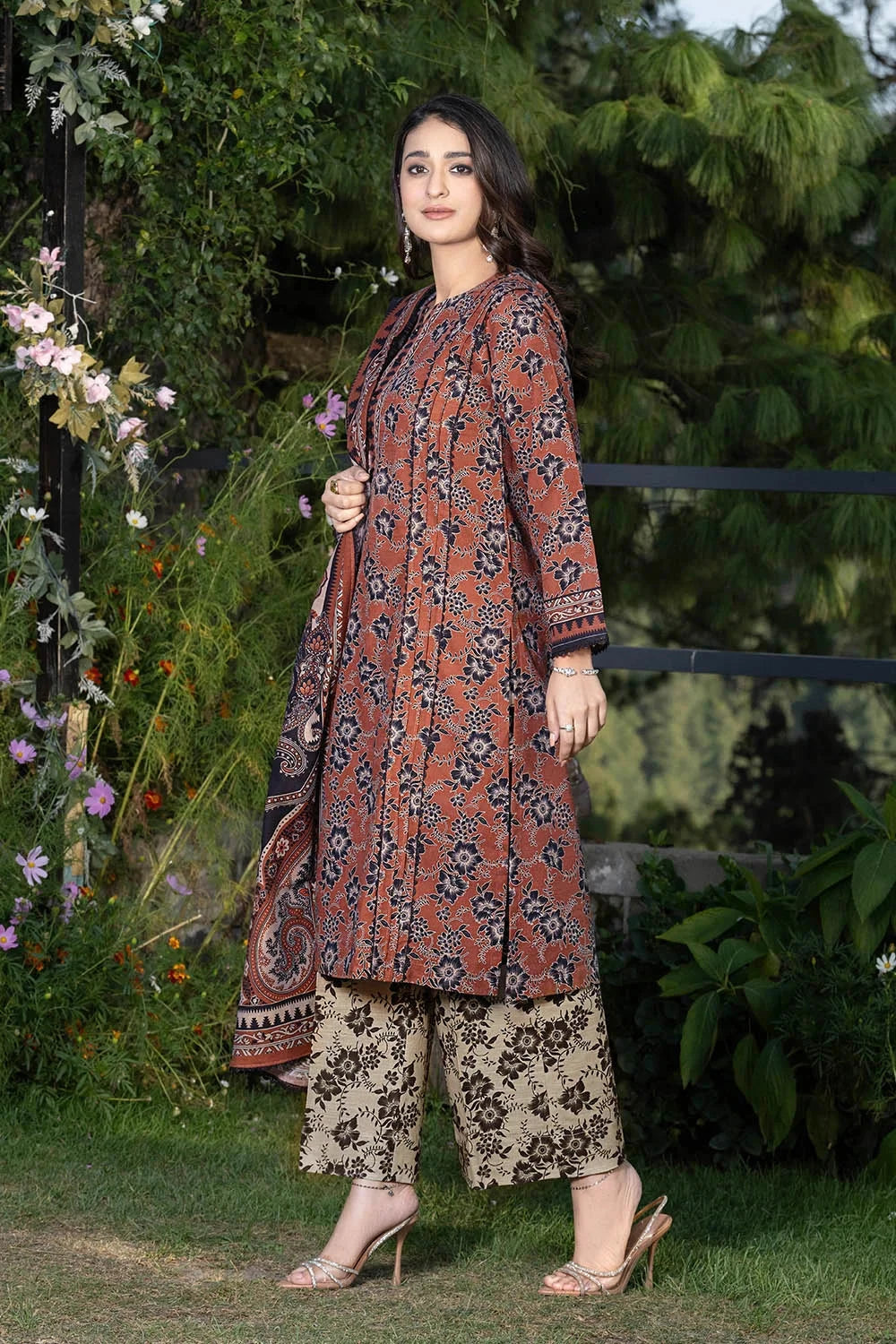 The suit features a beautifully printed khaddar fabric with intricate patterns that are both stylish and versatile for various occasions.