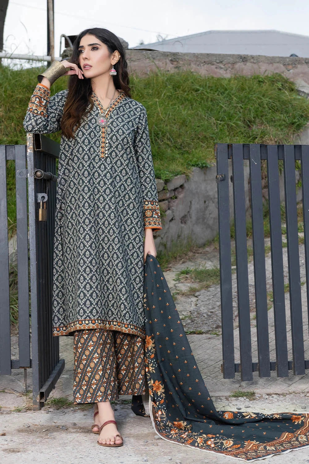 The suit features a beautifully printed khaddar fabric with intricate patterns that are both stylish and versatile for various occasions.