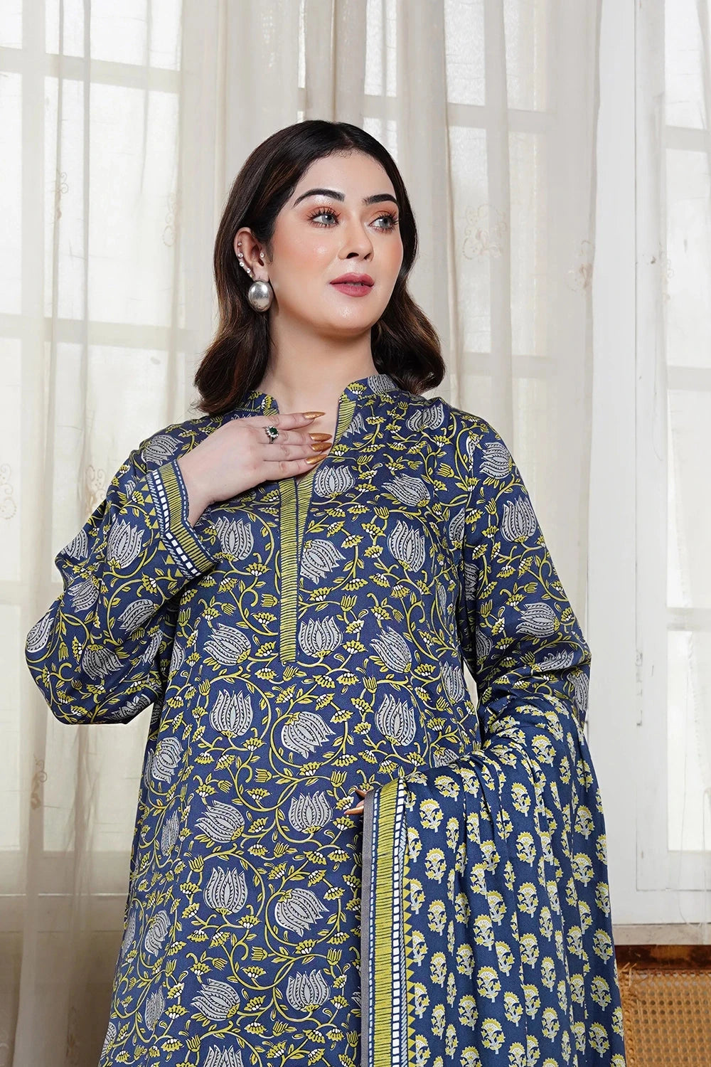 Explore Winter vibes 3pc Printed Kotail Linen Suit this collection features printed Kotail Linen shirt and printed trouser with printed Kotail Linen dupatta.