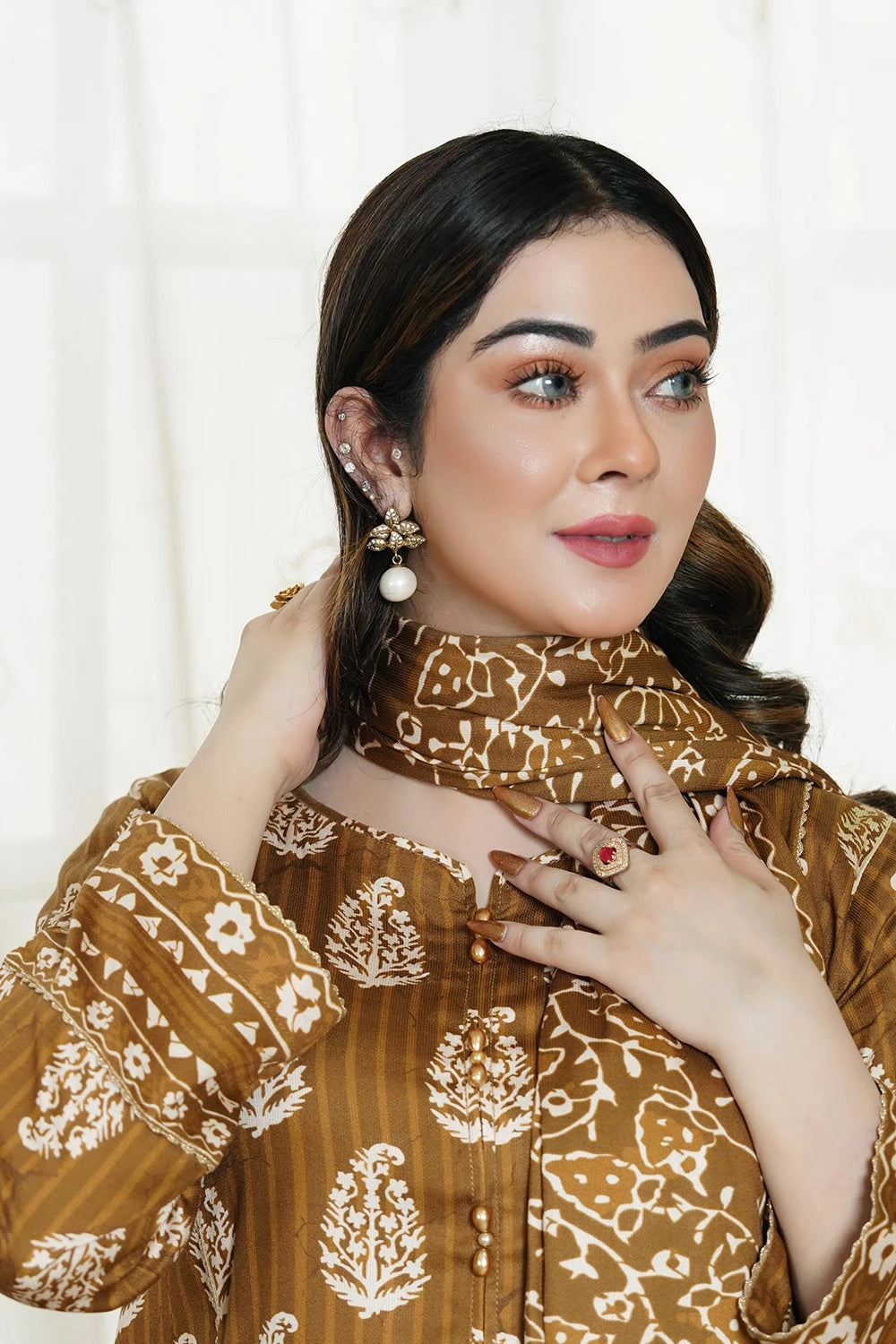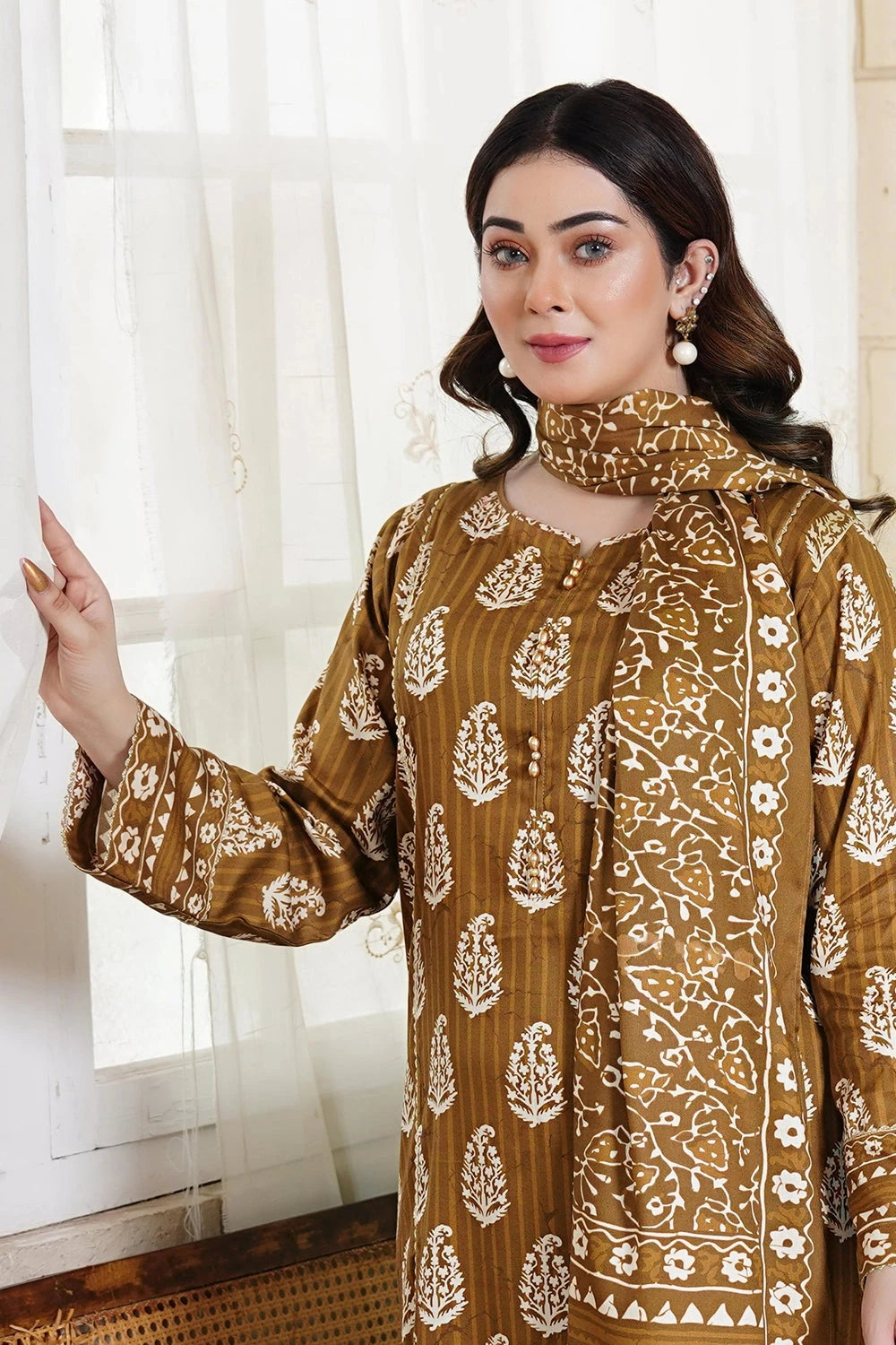 Explore Winter vibes 3pc Printed Kotail Linen Suit this collection features printed Kotail Linen shirt and printed trouser with printed Kotail Linen dupatta.