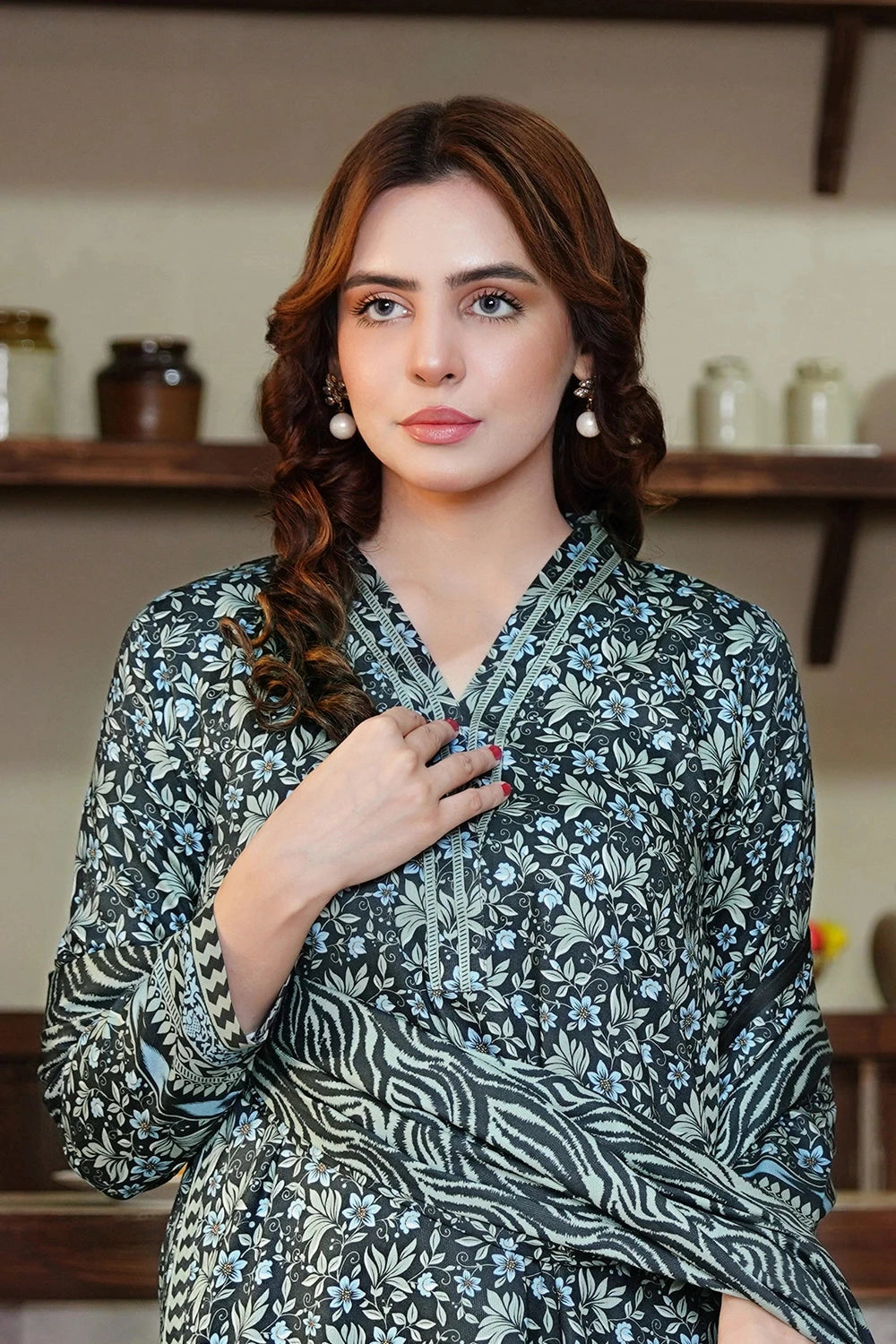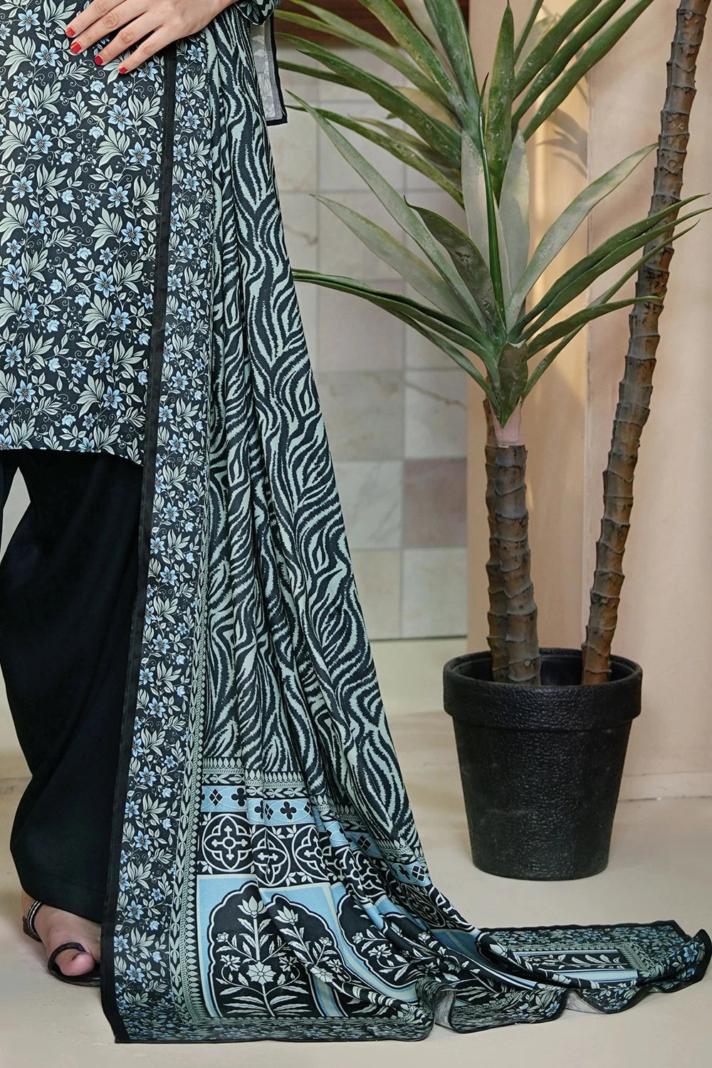 Explore Winter vibes 3pc Printed Kotail Linen Suit this collection features printed Kotail Linen shirt and printed trouser with printed Kotail Linen dupatta.