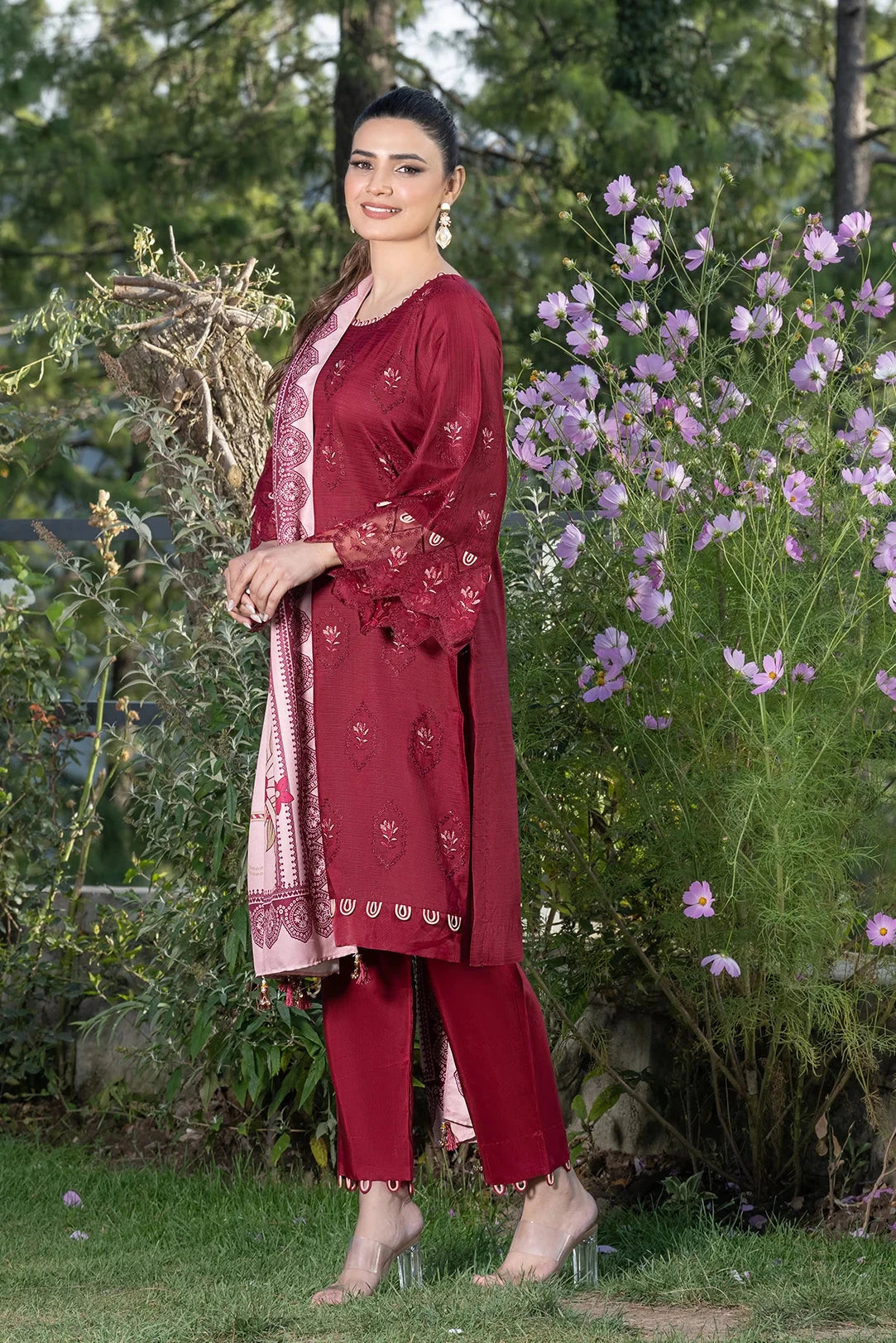 A stylish and breathable 3-piece linen suit featuring a shirt, trouser and dupatta perfect for casual wear, semi-formal gatherings, and everyday elegance.