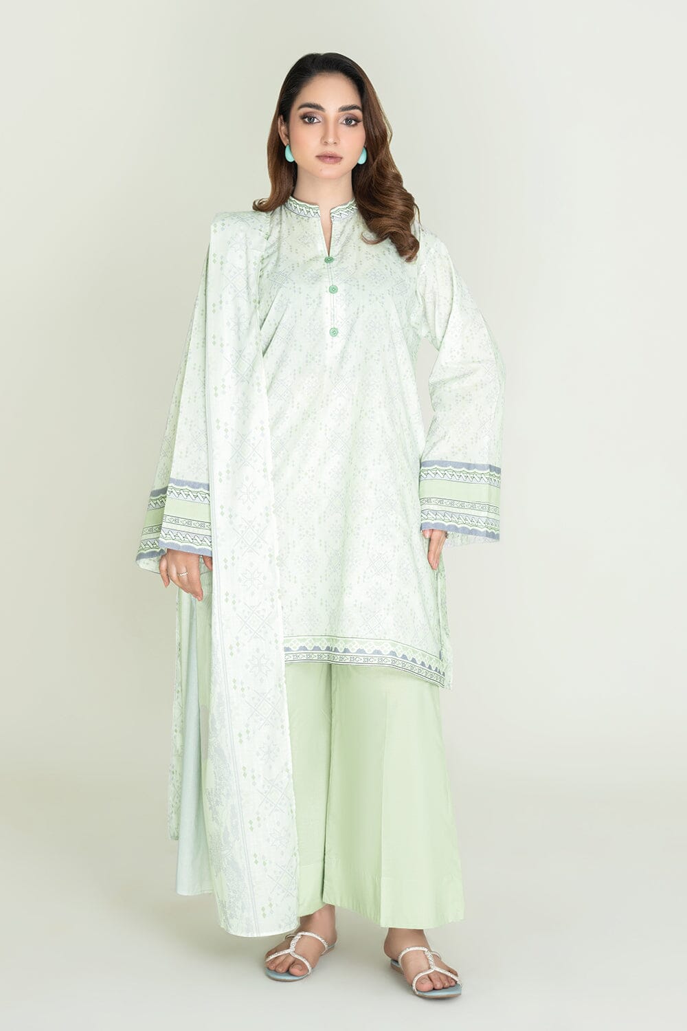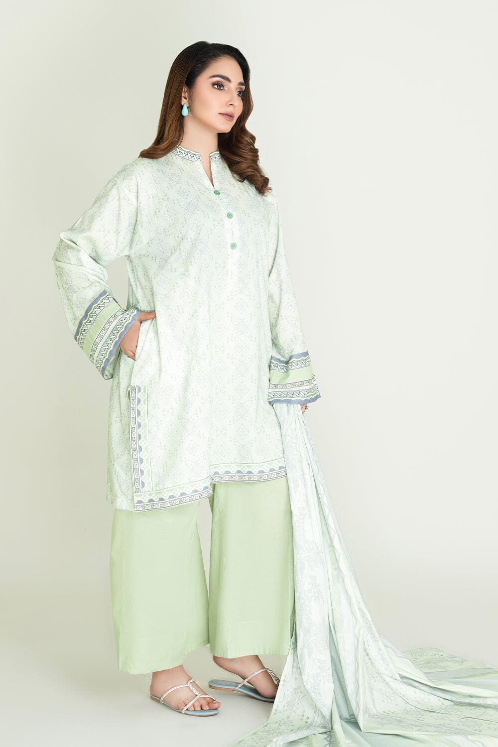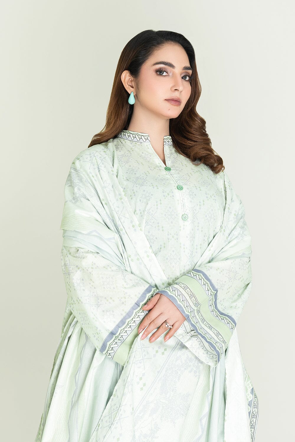 A stylish and breathable 3-piece lawn suit featuring a printed shirt, dyed trouser, and matching printed dupatta-perfect for effortless elegance and all-day comfort.