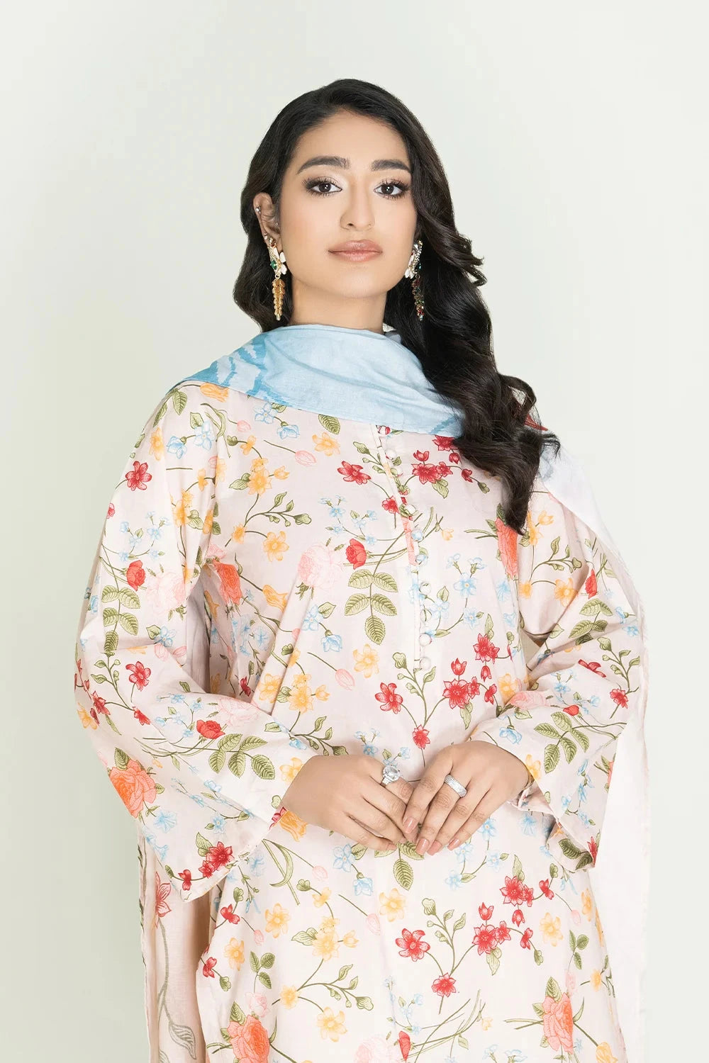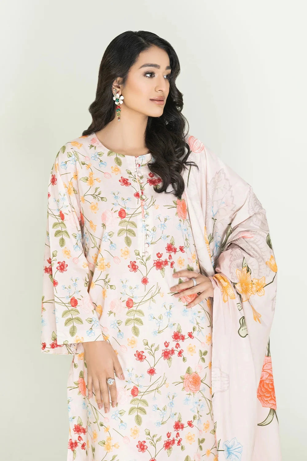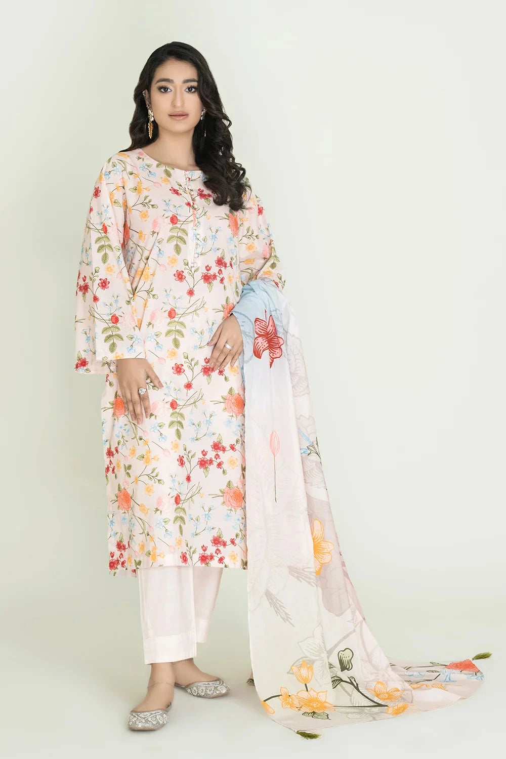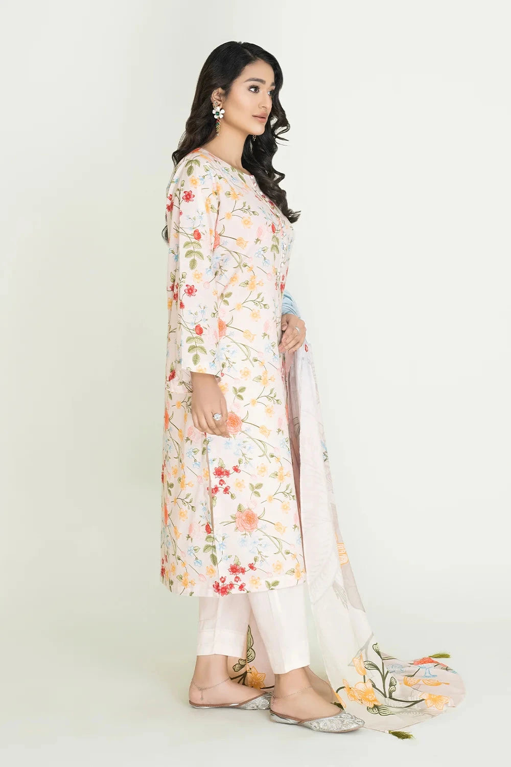 A stylish and breathable 3-piece lawn suit featuring a printed shirt, dyed trouser, and matching printed dupatta-perfect for effortless elegance and all-day comfort.
