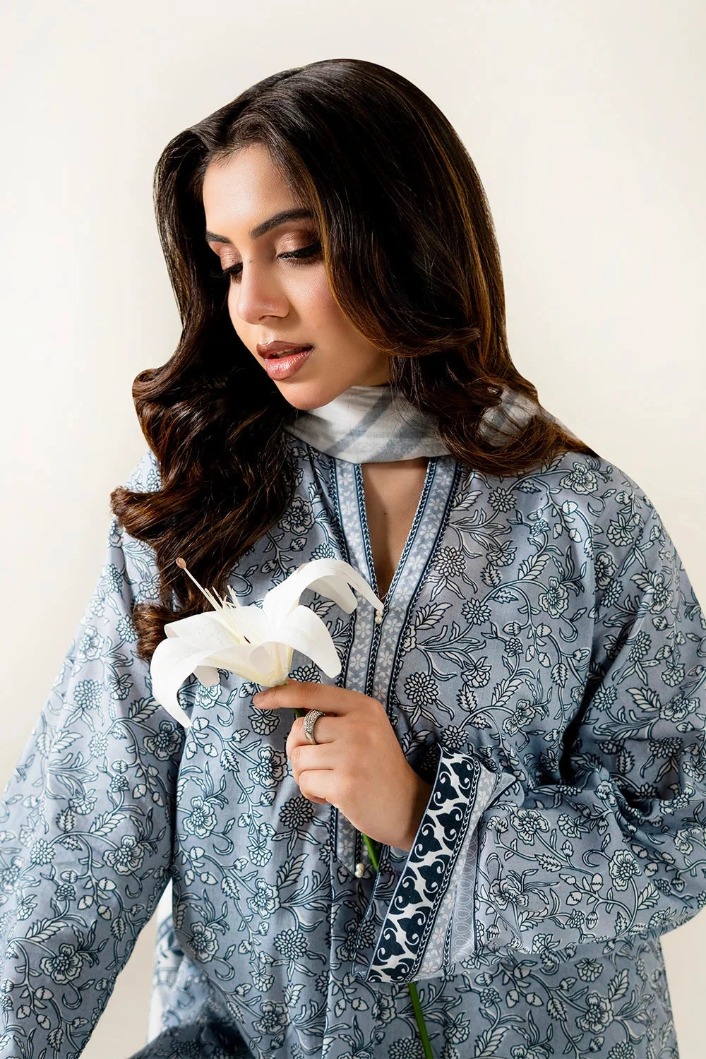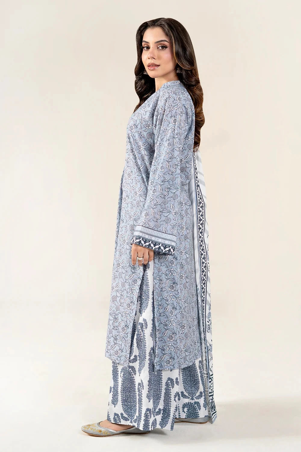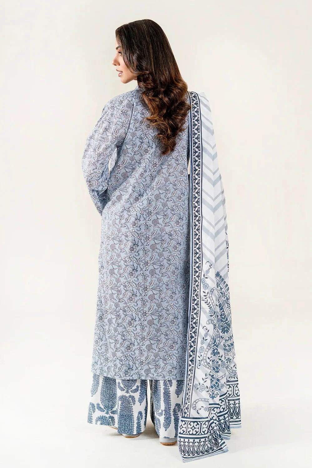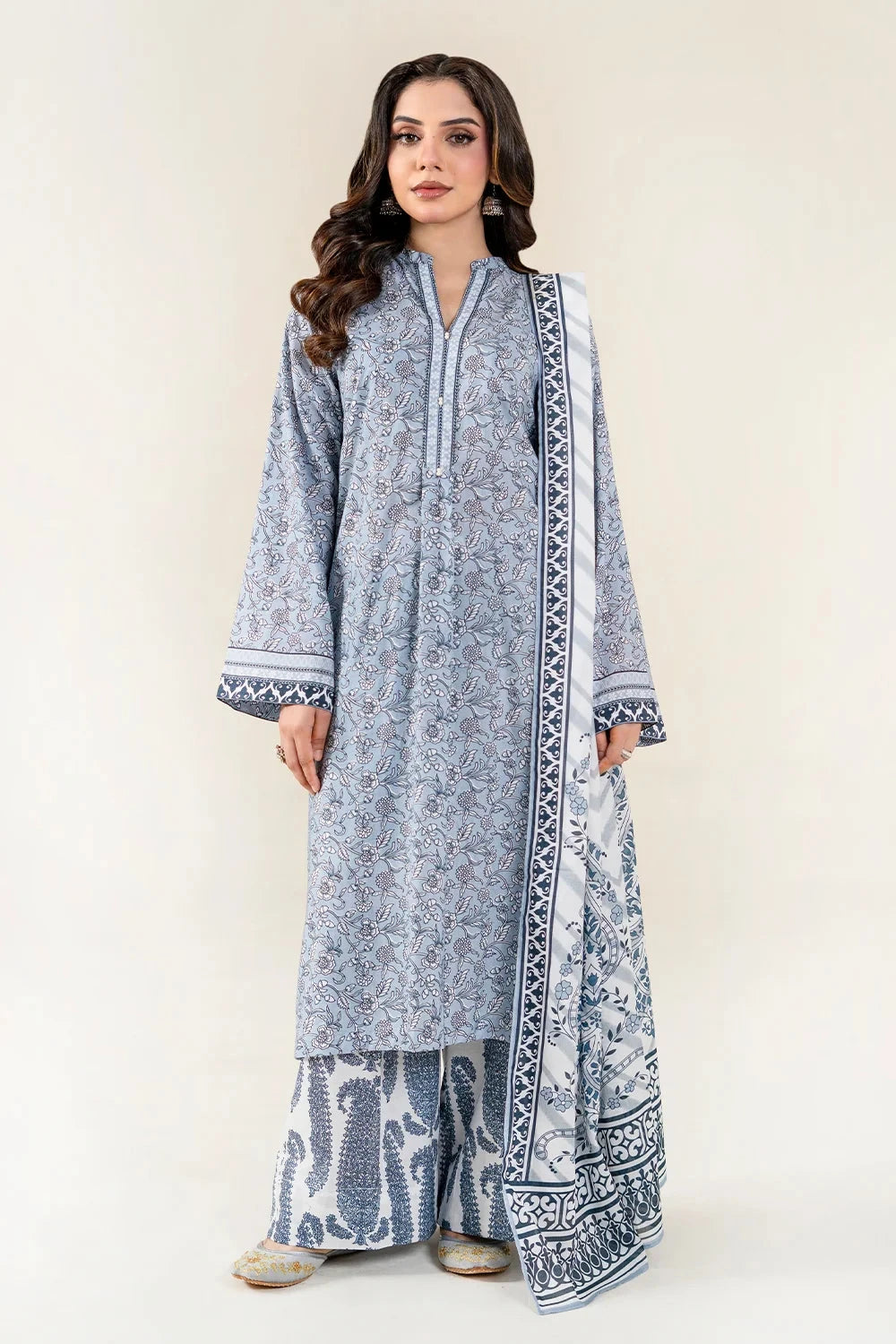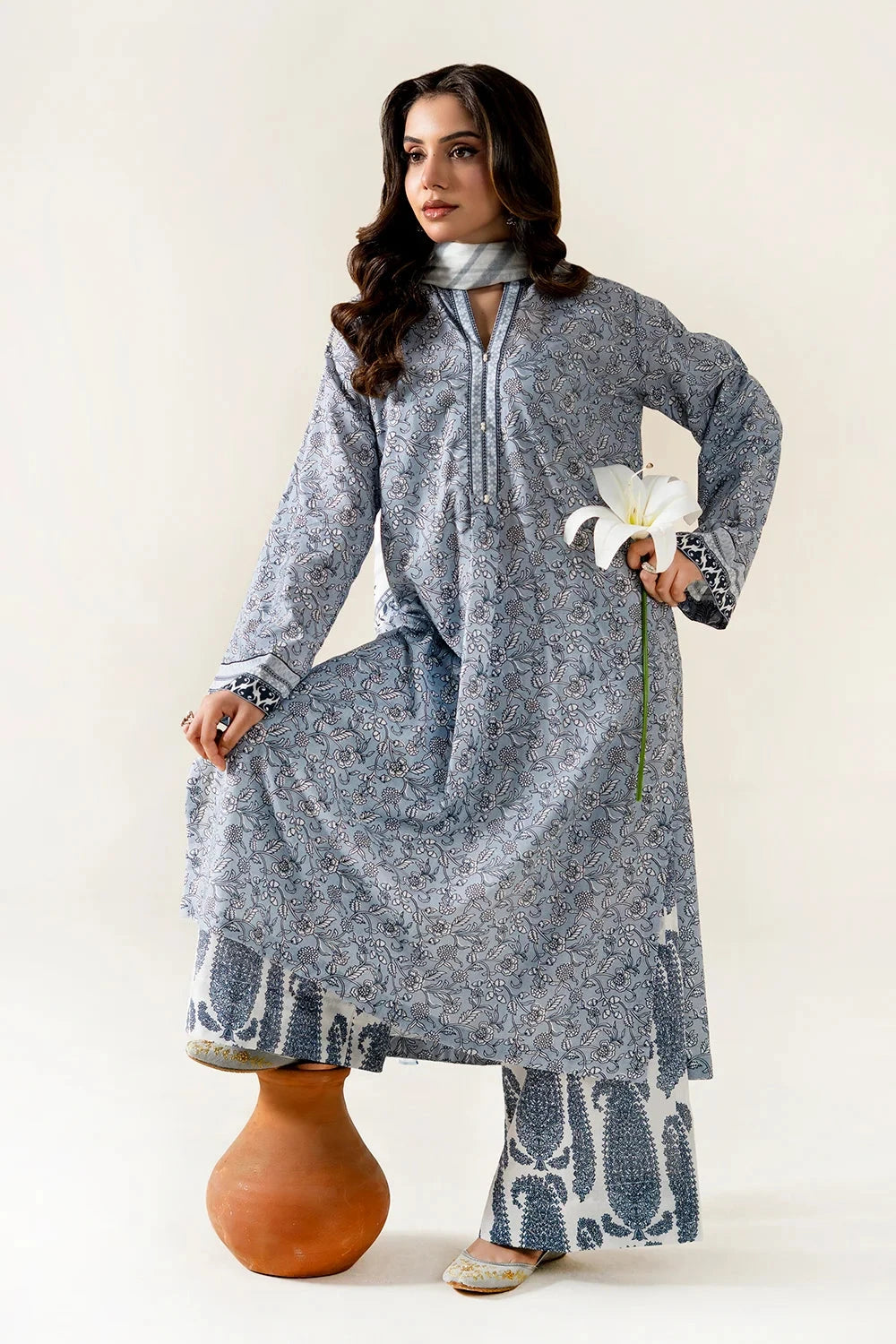 A stylish and breathable 3-piece lawn suit featuring a printed shirt, dyed trouser, and matching printed dupatta-perfect for effortless elegance and all-day comfort.