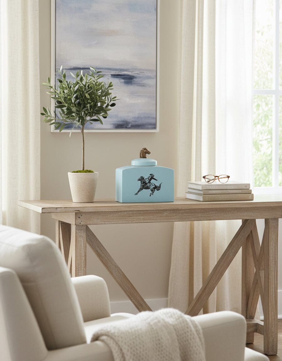 Bring a touch of artistry and heritage to your décor with the Azure Cavalier Ceramic Jar — a stunning fusion of modern craftsmanship and equestrian-inspired elegance. Finished in a soft pastel blue glaze, this statement piece features a bold black illustration of a gallant horse rider, evoking a sense of motion and grace.