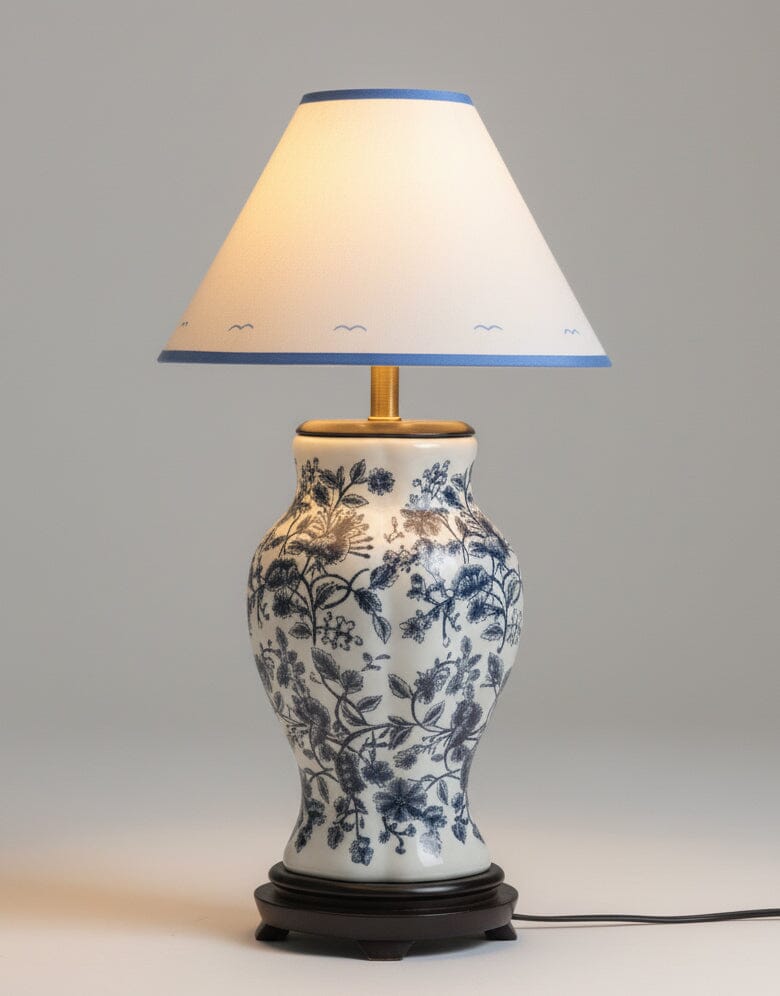 Illuminate your home with timeless charm. This elegant ceramic table lamp features intricate blue floral patterns inspired by classic porcelain art. Its graceful silhouette, complemented by a soft fabric shade with blue trim, adds a touch of sophistication to any interior.