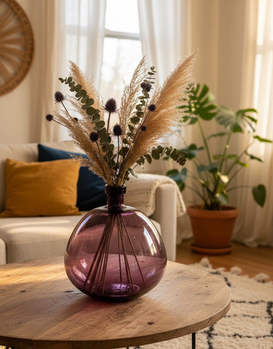 Enhance your décor with this beautifully crafted purple glass vase, featuring a rounded silhouette and a smooth, glossy finish. The rich plum tone with subtle variations adds depth and sophistication, making it a perfect statement piece for modern and contemporary interiors.