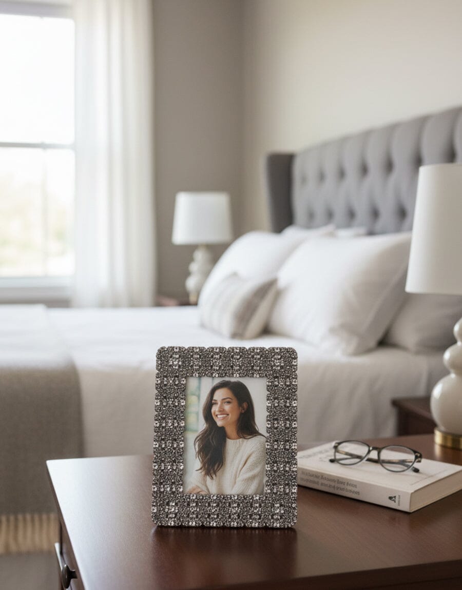Add a touch of timeless elegance to your home décor with this beautifully crafted crystal-embellished photo frame. Designed with intricate detailing and shimmering accents, it enhances your cherished memories with a luxurious sparkle.