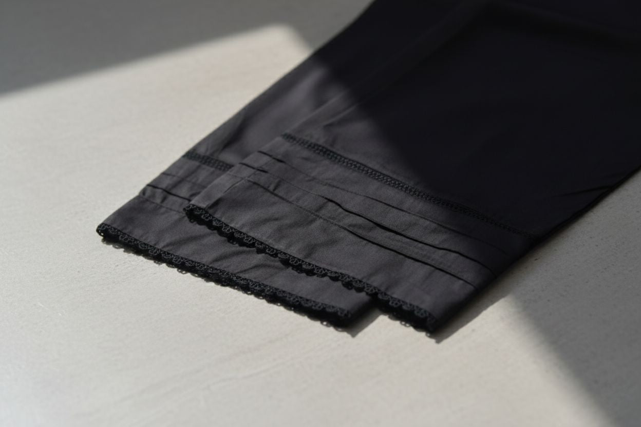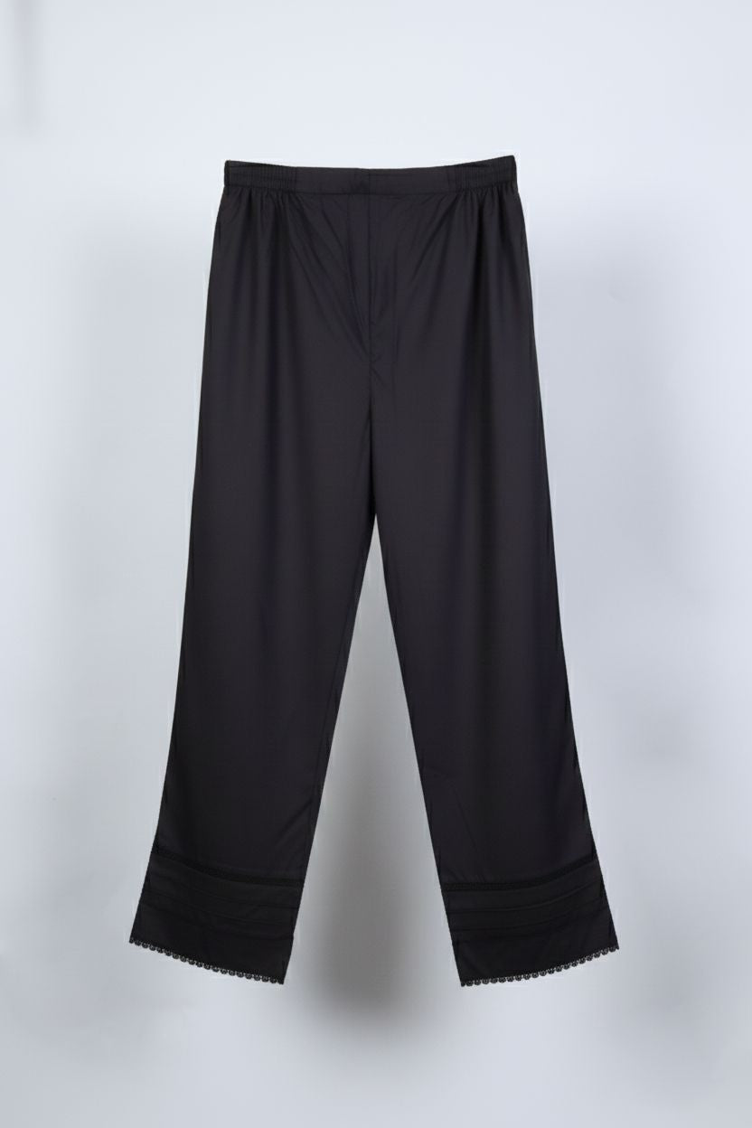 Upgrade your wardrobe with this elegant black cotton trouser, designed for all-day comfort and effortless style. Crafted from premium-quality cotton fabric, it features a comfortable elasticated waistband for a perfect fit. The subtle detailing at the hem, including delicate lace accents and pleated finishing, adds a refined touch to a classic silhouette. Ideal for pairing with printed or solid shirts, this trouser is a versatile essential for both casual and semi-formal looks.