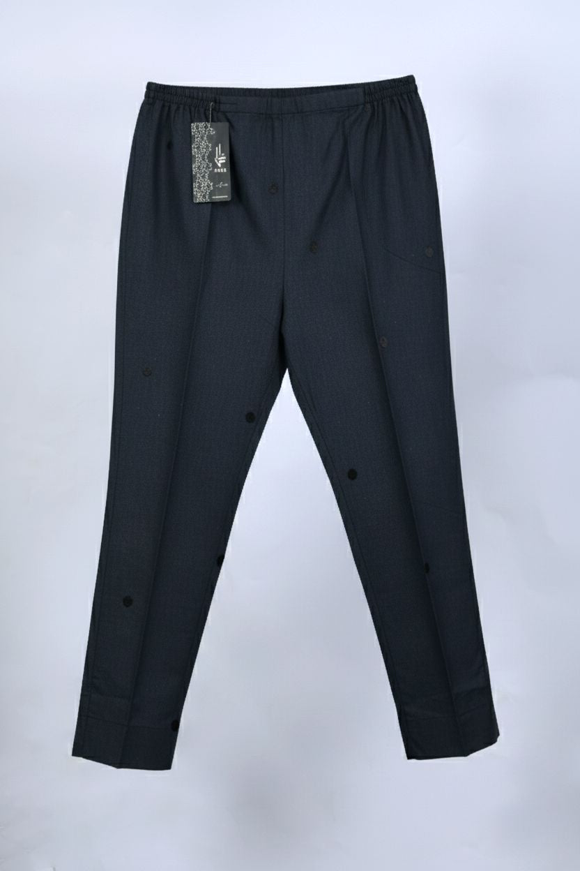 Upgrade your wardrobe with this elegant Charcoal Black cotton trouser, designed for all-day comfort and effortless style. Crafted from premium-quality cotton fabric, it features a comfortable elasticated waistband for a perfect fit. The subtle detailing at the hem, including delicate lace accents and pleated finishing, adds a refined touch to a classic silhouette. Ideal for pairing with printed or solid shirts, this trouser is a versatile essential for both casual and semi-formal looks.