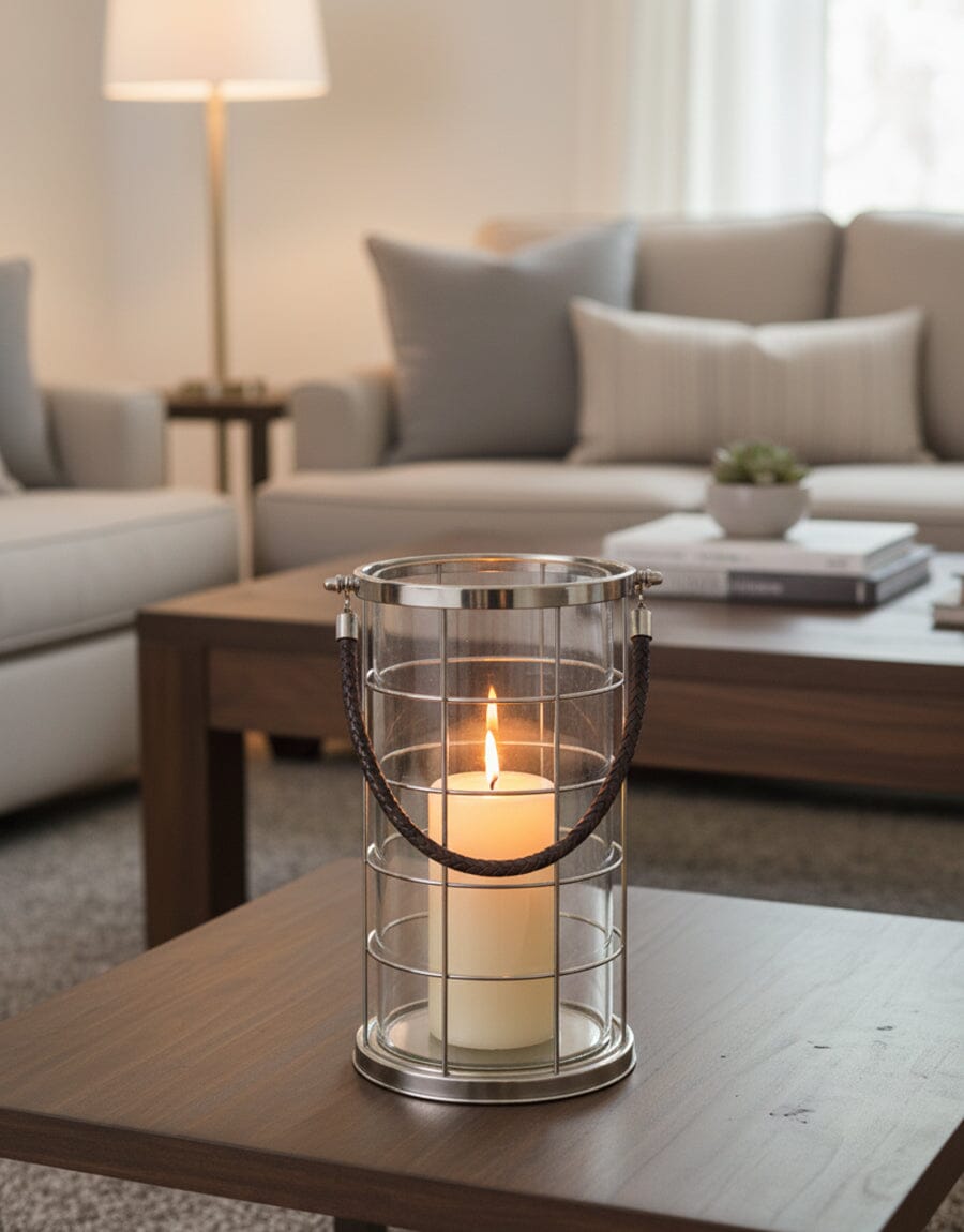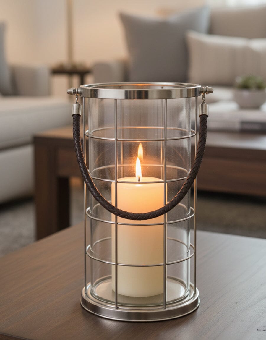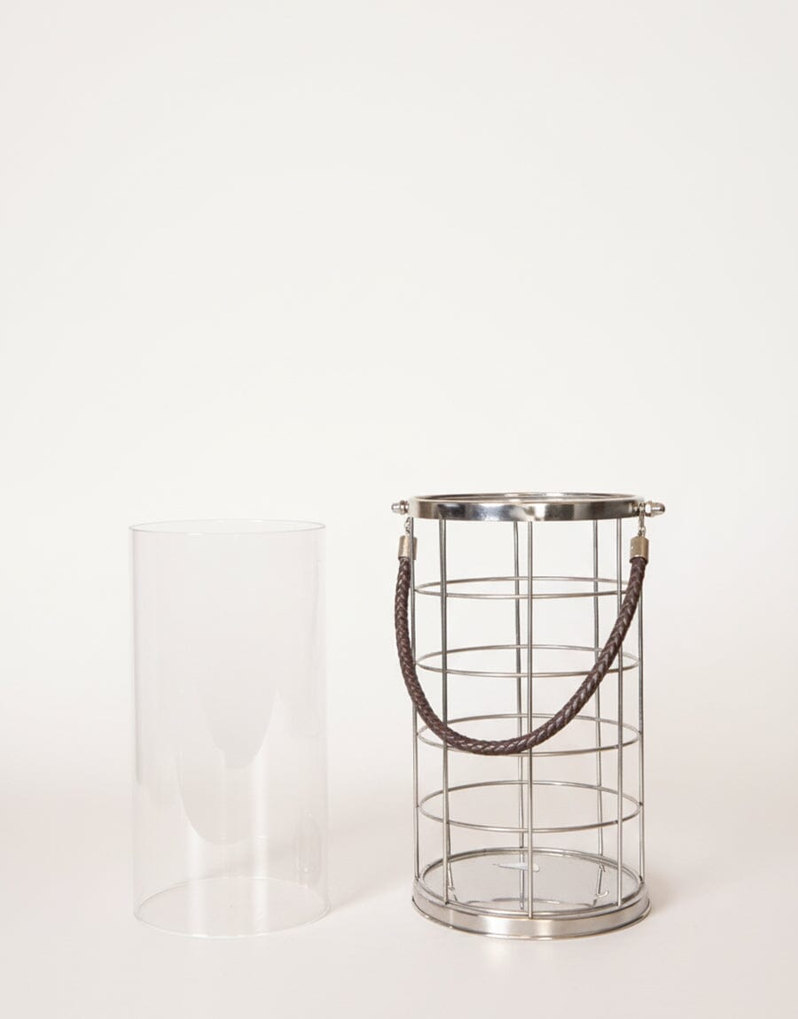 Bring a refined industrial charm to your décor with this metal cage glass lantern. Featuring a clear cylindrical glass insert encased in a sleek metal frame, this piece is finished with a sturdy braided handle for easy carrying or hanging. Its clean lines and minimalist design make it a versatile accent for modern, contemporary, or rustic interiors.