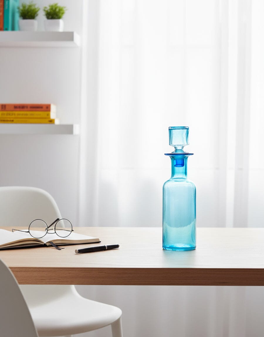 Perfect for styling on desks, shelves, side tables, or consoles, this decorative bottle works beautifully as a standalone statement piece or paired with other glass décor.