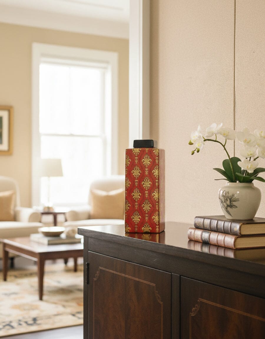 Opulent and timeless, this red ceramic jar features intricate gold damask detailing that exudes classic luxury. The glossy surface and elegant square silhouette make it a perfect statement piece for any refined interior.