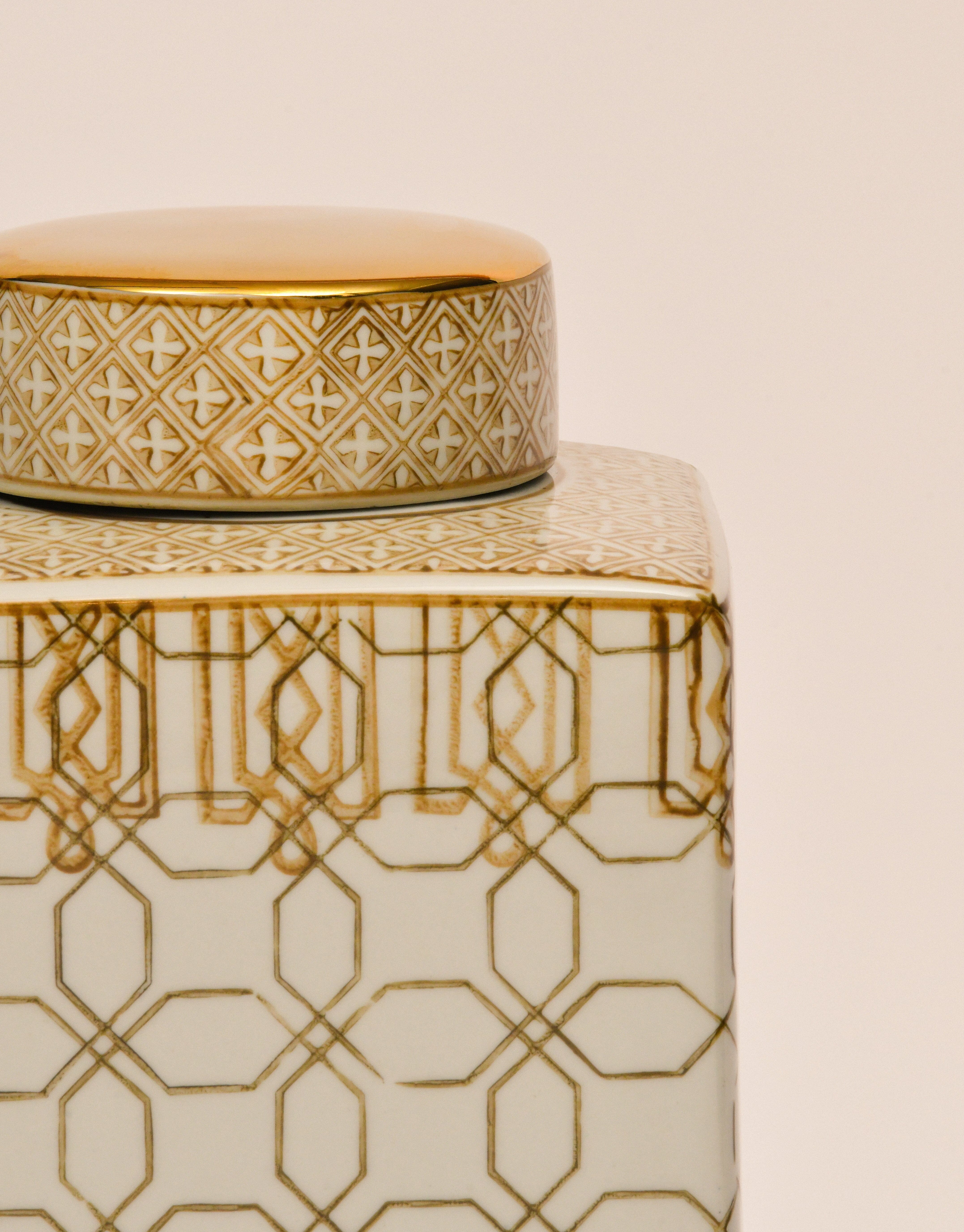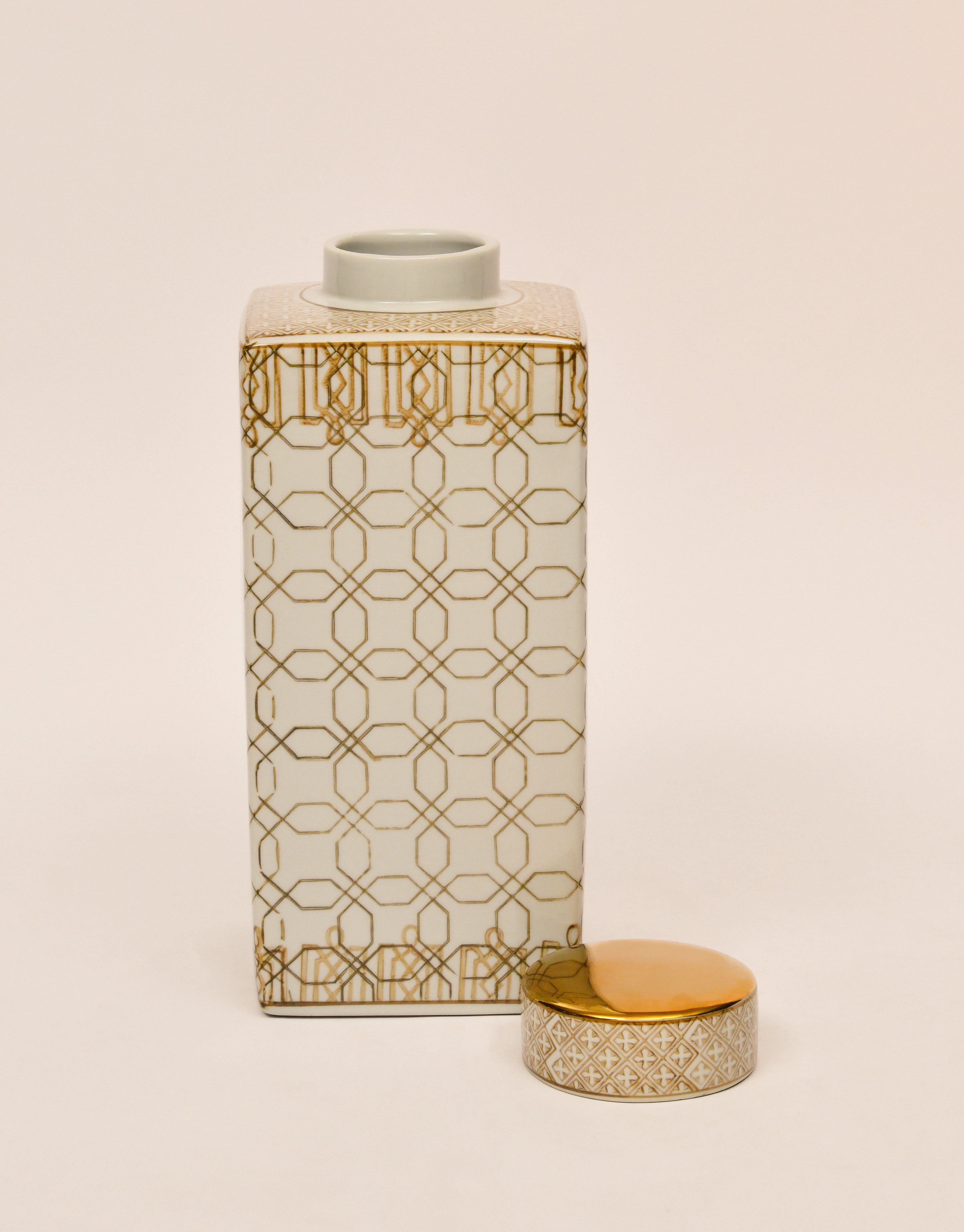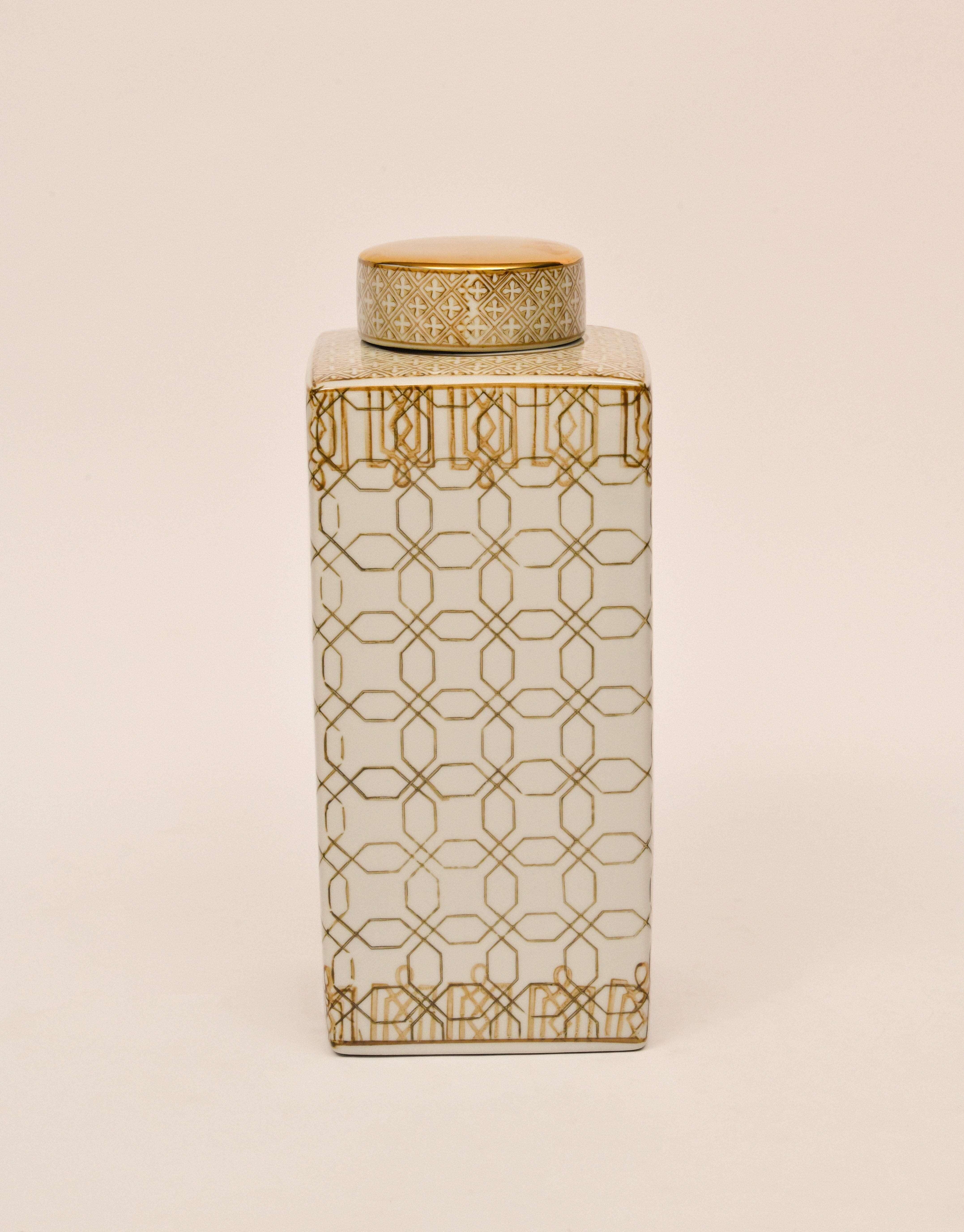 Refined simplicity meets modern luxury. This elegant ceramic jar features a pristine white glaze adorned with intricate gold geometric patterns and a polished gold lid — creating a timeless décor accent that exudes sophistication.